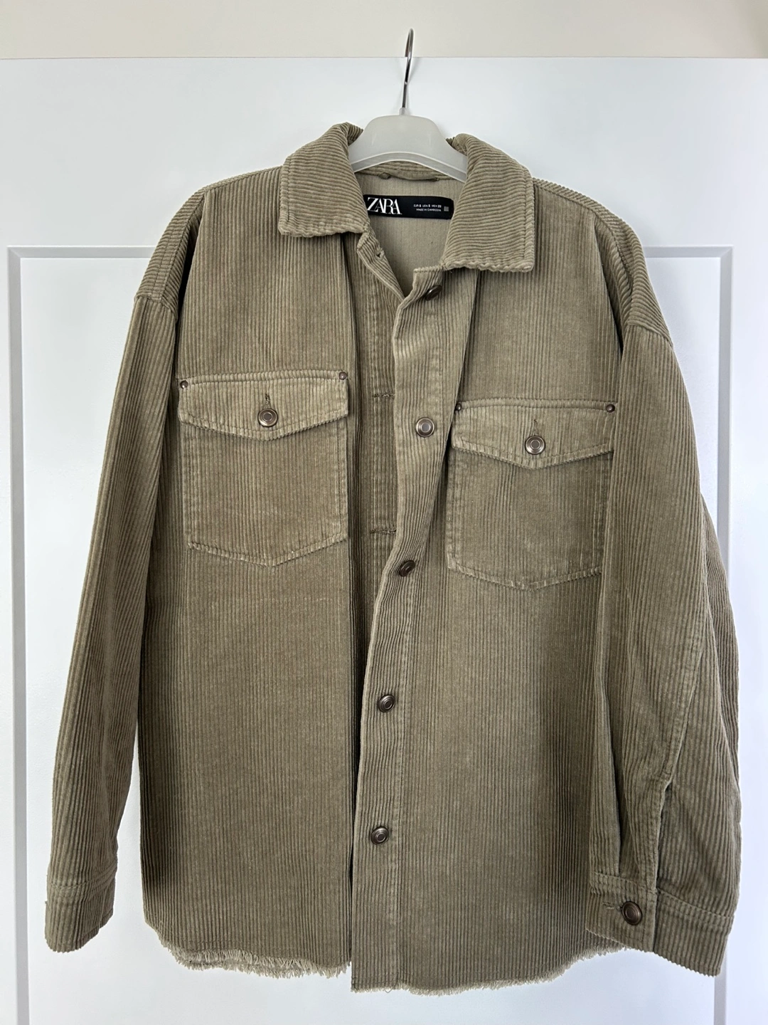 Olive green corduroy shirt jacket. Button-up closure. Two flap pockets. Relaxed fit. Raw hem.