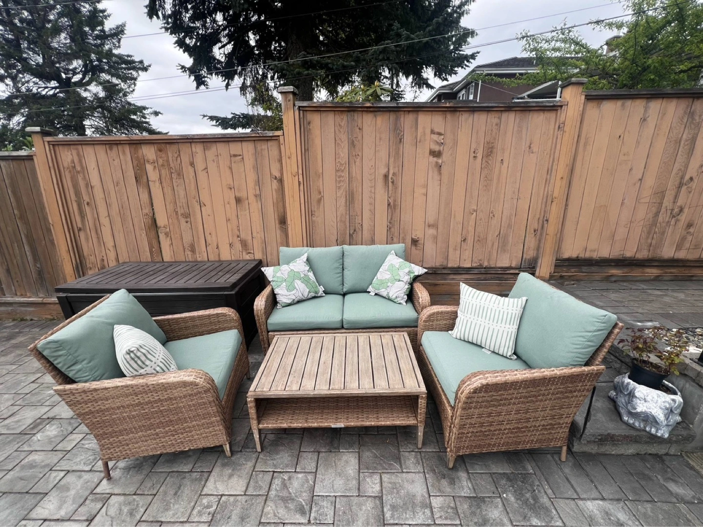 Four-piece patio conversation set. Includes loveseat, two armchairs, and coffee table. Wicker construction with light teal cushions. All-weather material. Perfect for your outdoor space.
