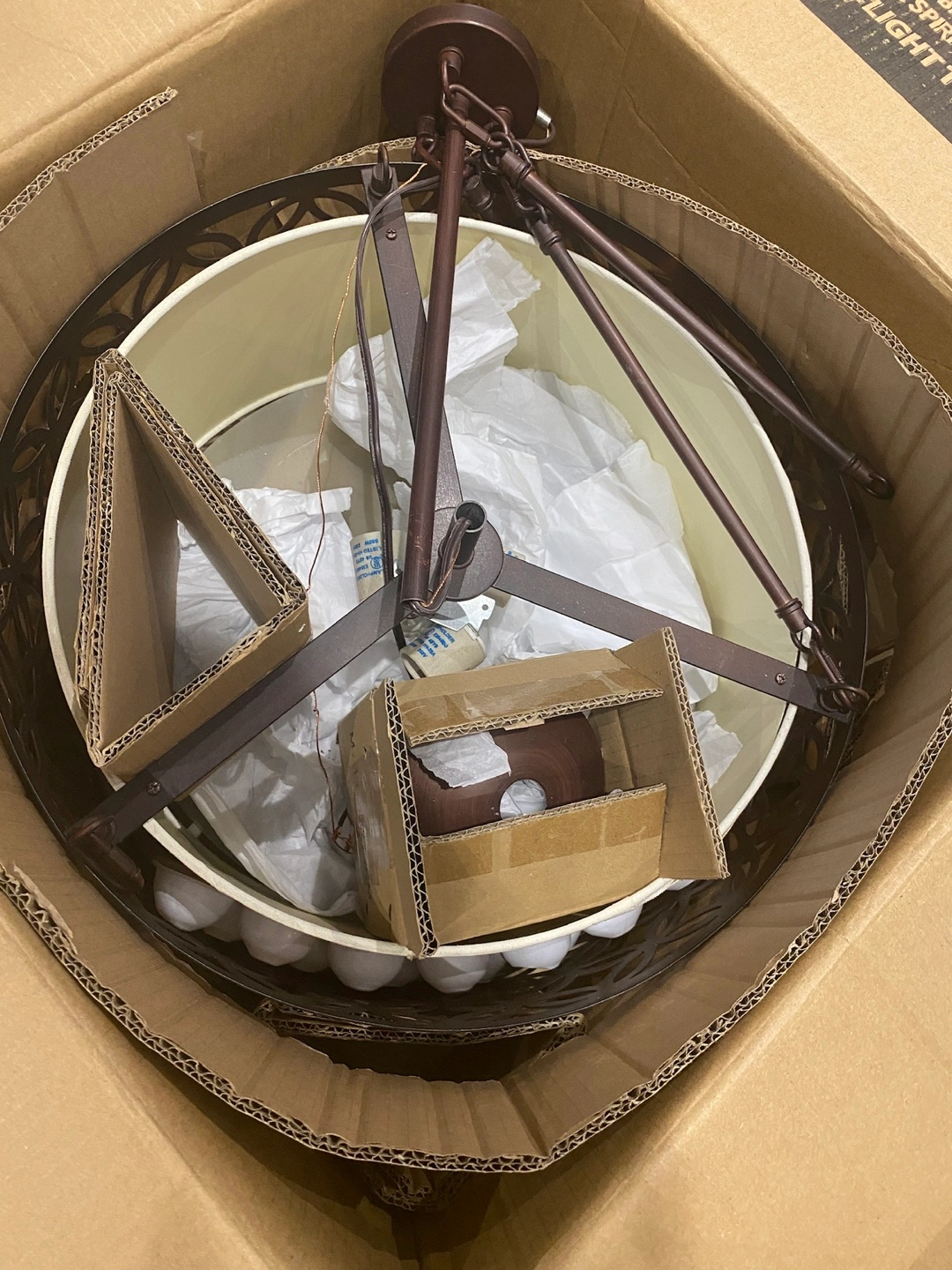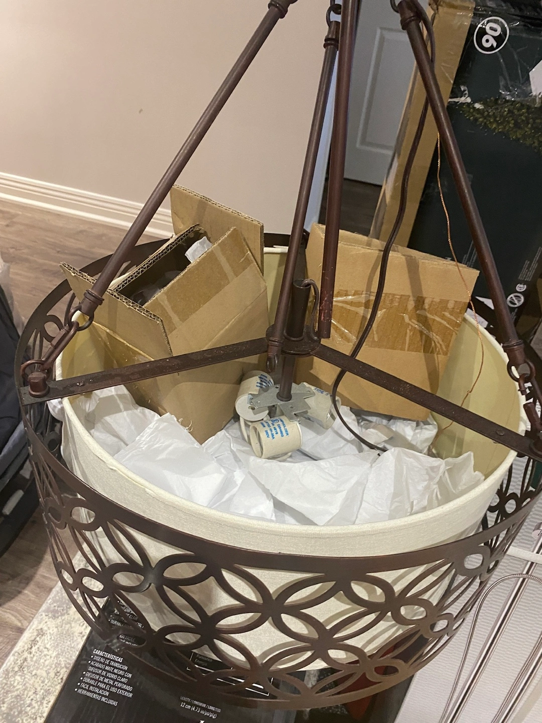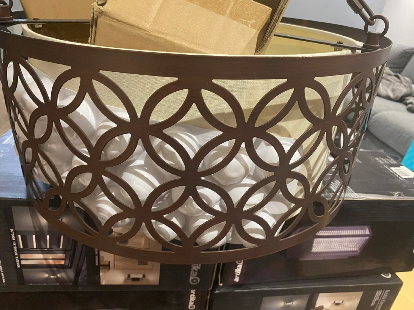Beautiful chandelier, bronze finish, cream fabric shade. Intricate cut-out design. New in box, some assembly required. Perfect for dining room or living room.