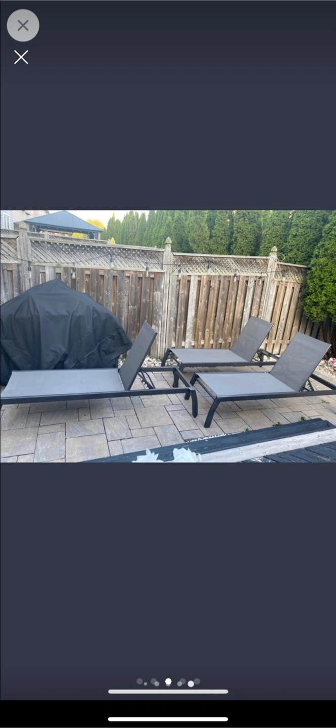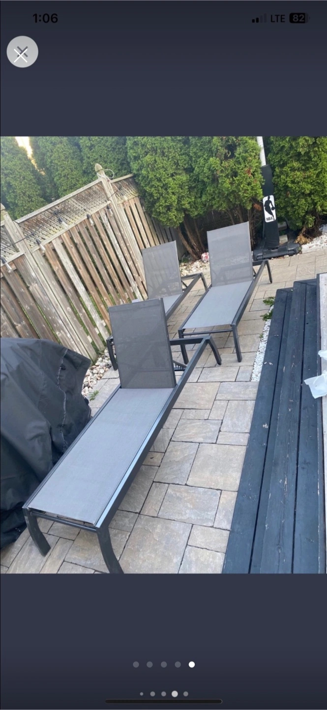 Two grey sling chaise lounge chairs. Aluminum frames. Adjustable positions. Great for patio or poolside. Used condition. Some rush here and there $80 each