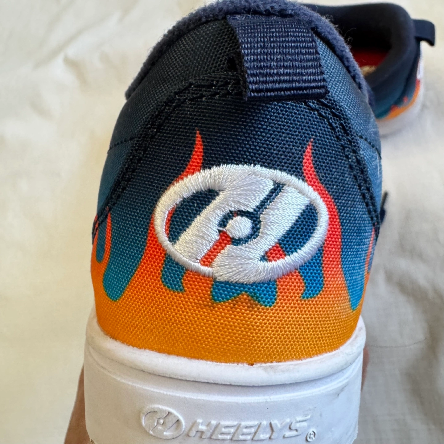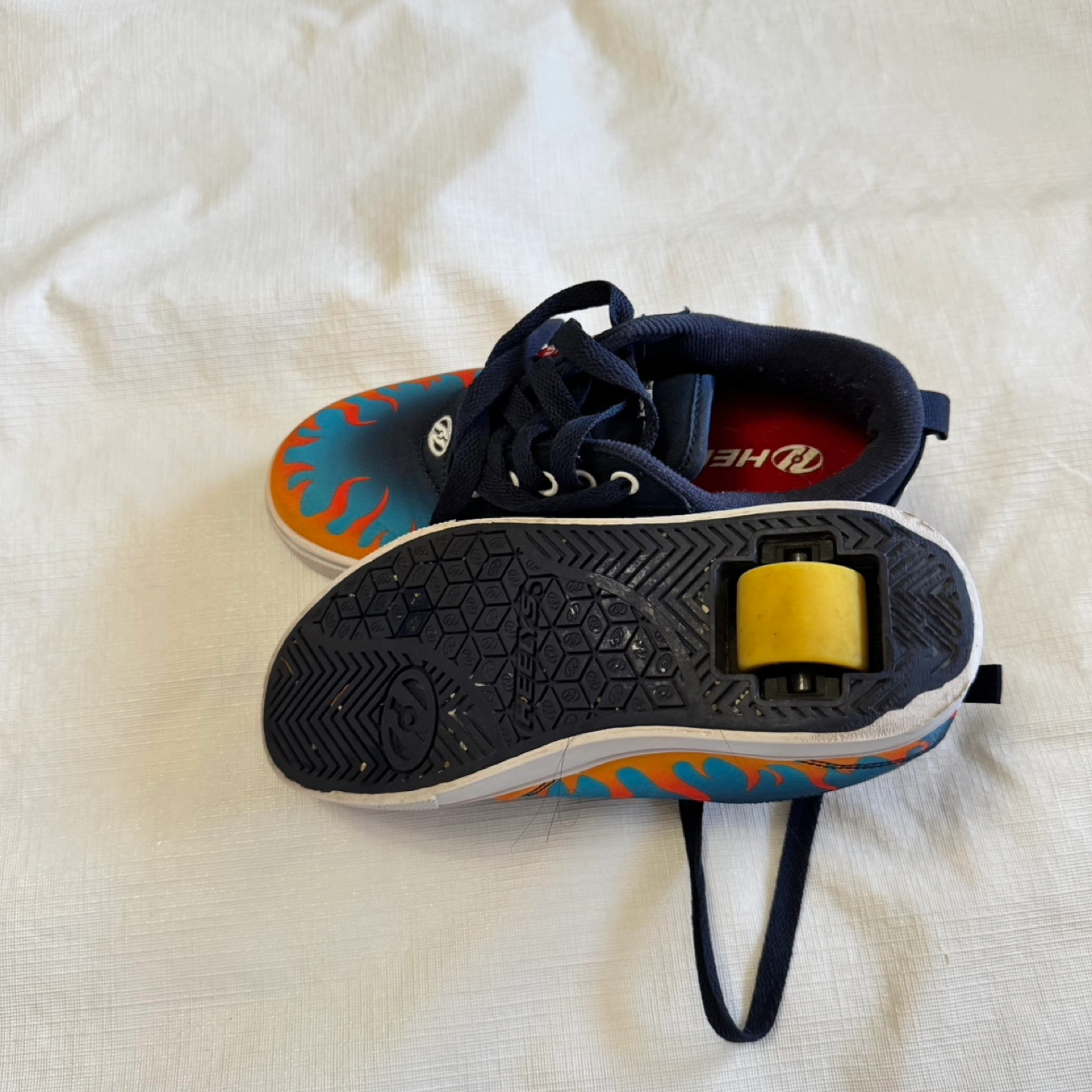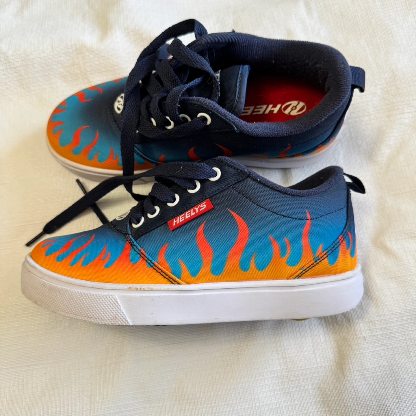 Used Heelys roller skates. Flame graphic design. Size UK 2, US YTH 3, EUR 21, CM 21. Good condition, minor wear.