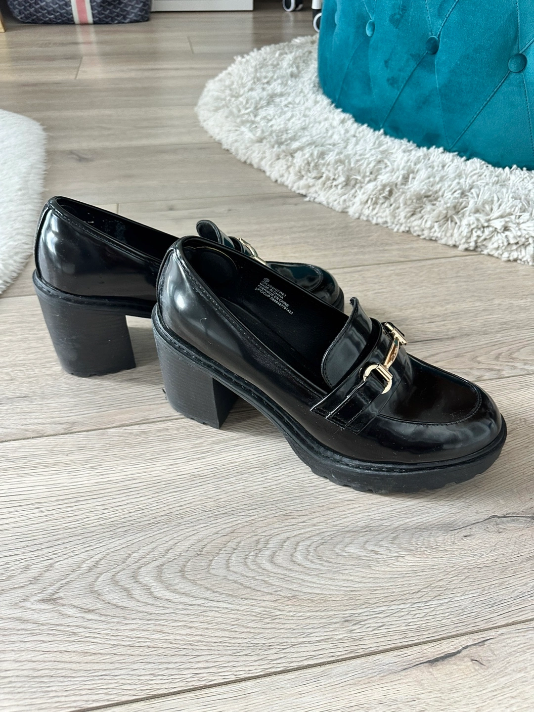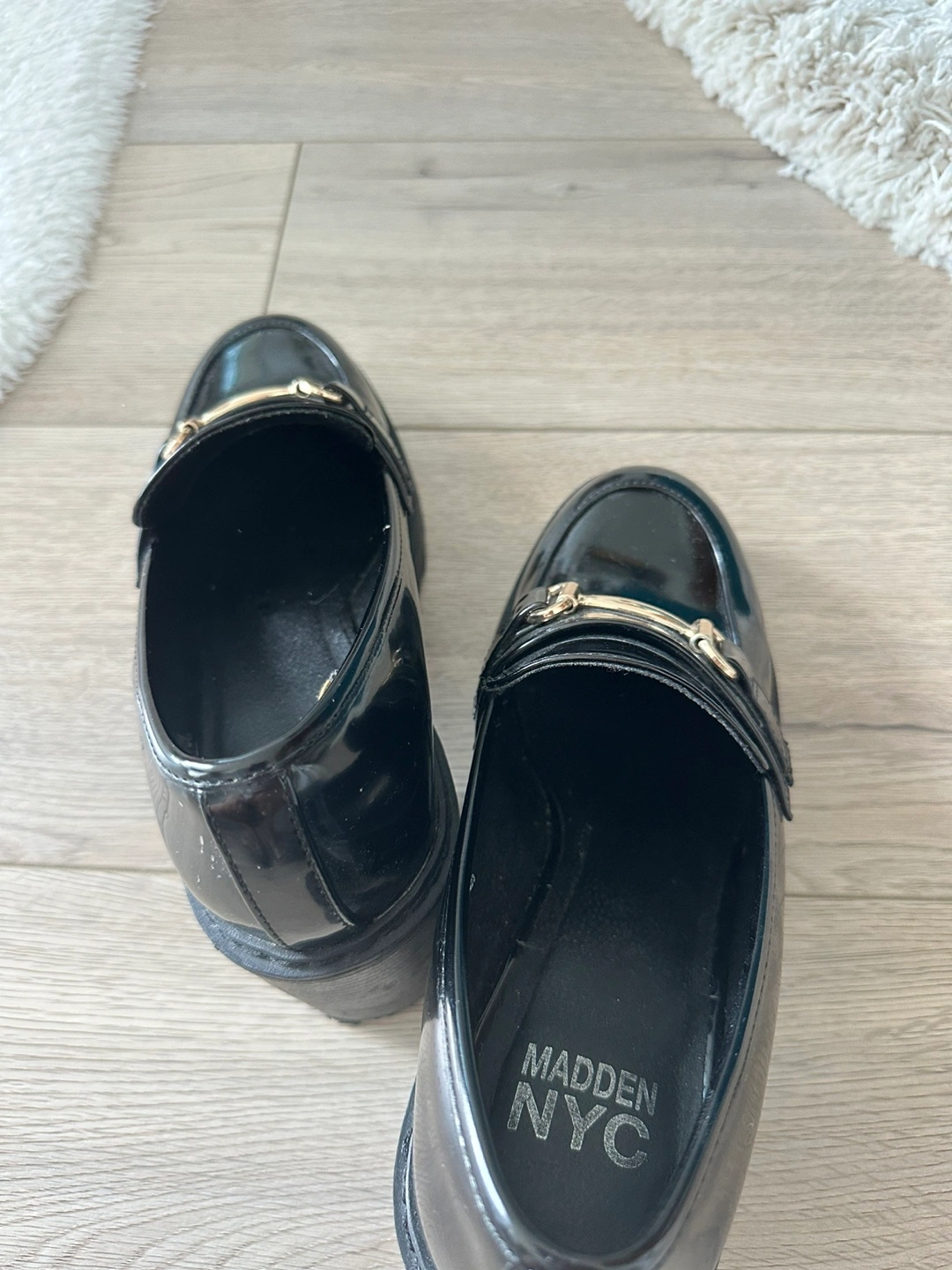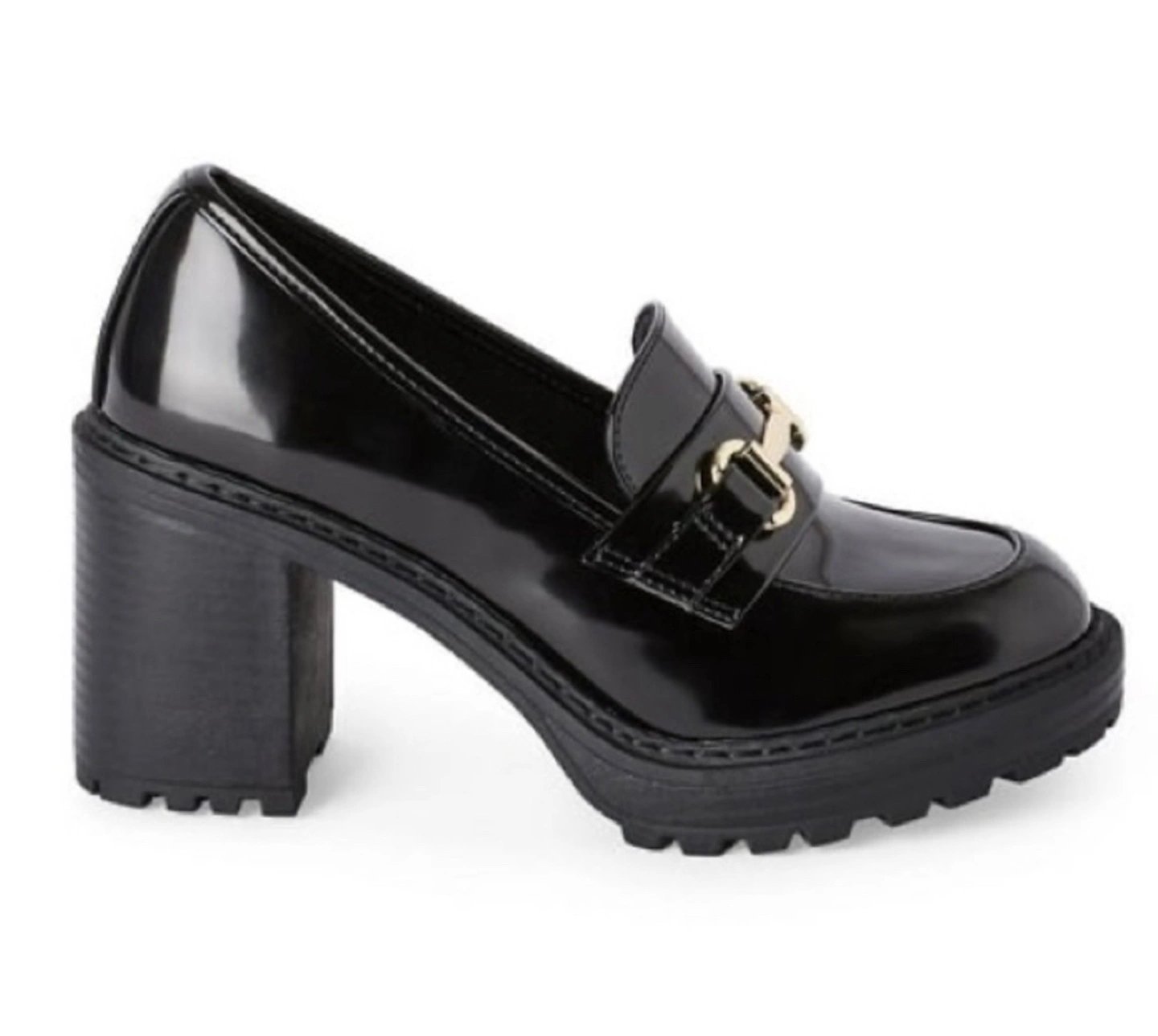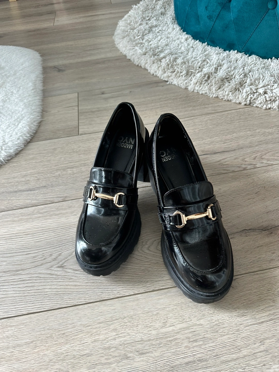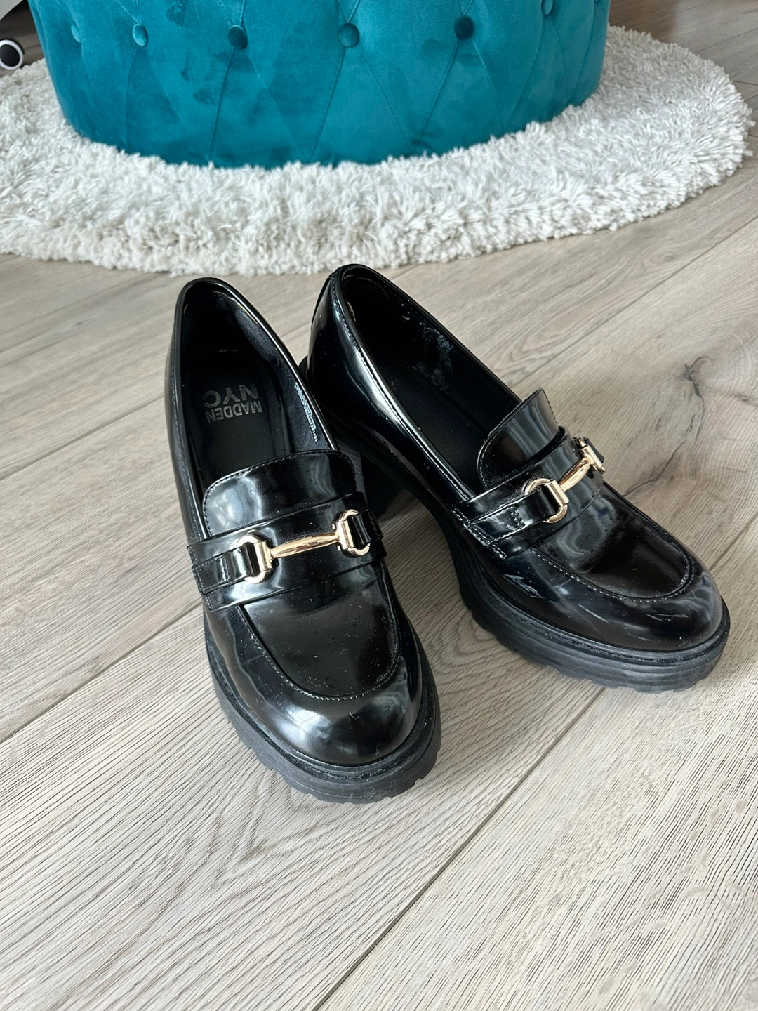584Madden NYC Kassidy Black Block Heeled Platform Loafers Size 10 in great condition. Madden NYC women's Kassidy heeled loafers are an on-trend choice for your shoe collection. Featuring an upper crafted from shiny faux leather, they're designed with a round toe, gold hardware, and a rubber outsole. They're also designed with a high block heel for some extra lift. Style them with a crew-neckline sweater, an A-line skirt, and knit tights for a fashionable and reliable everyday look. • Faux leather upper • Rubber outsole • Round toe • Gold hardware • High block heel Heel Height 3 inches