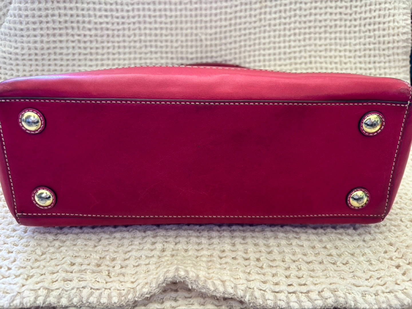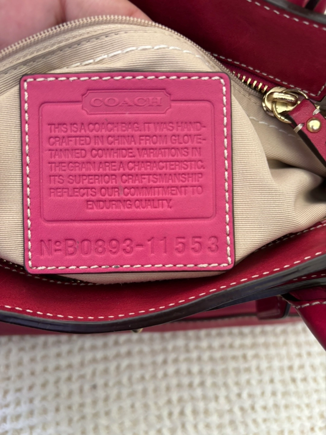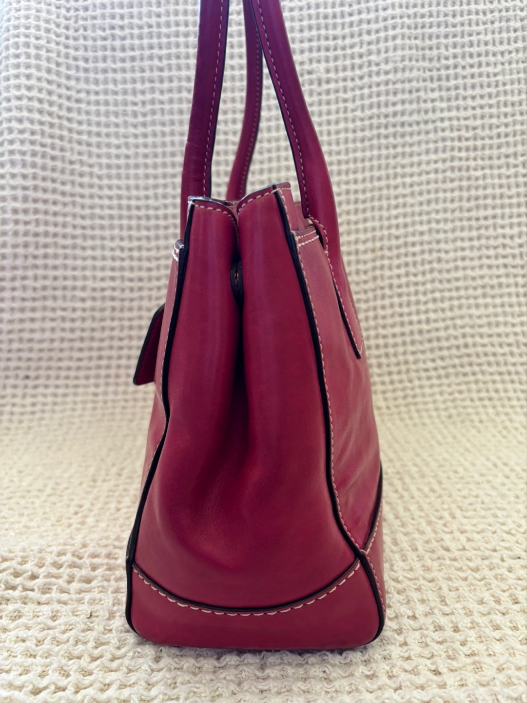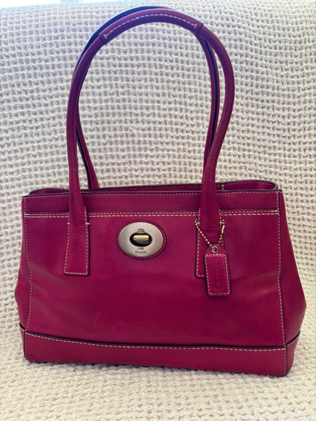 Pink vintage leather tote bag. Features two top handles and a Coach logo. Stitching detail throughout. Gold-toned hardware.