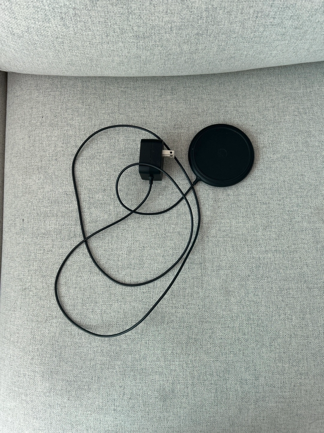 Black wireless charging pad and adapter. Charging cable included. Compact and convenient for everyday use. Can charge iphones
