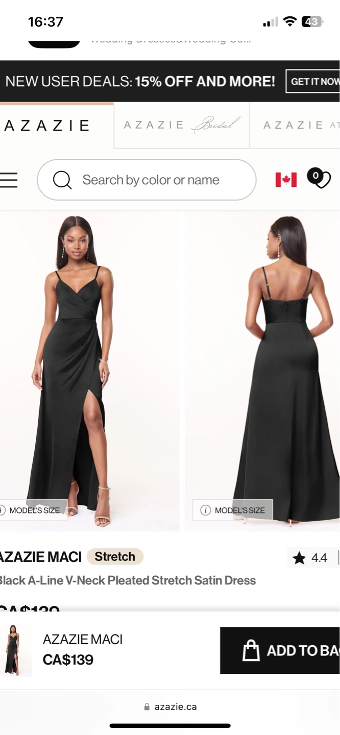 Azazie Maci Black A-Line V-Neck Pleated Stretch Satin Dress