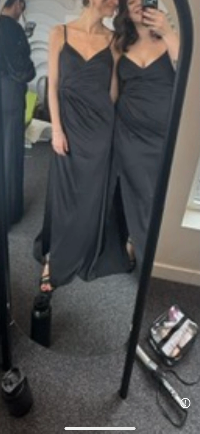 Black A-line V-neck pleated stretch satin dress. Features a side slit. Size 2. Worn only once for a wedding.