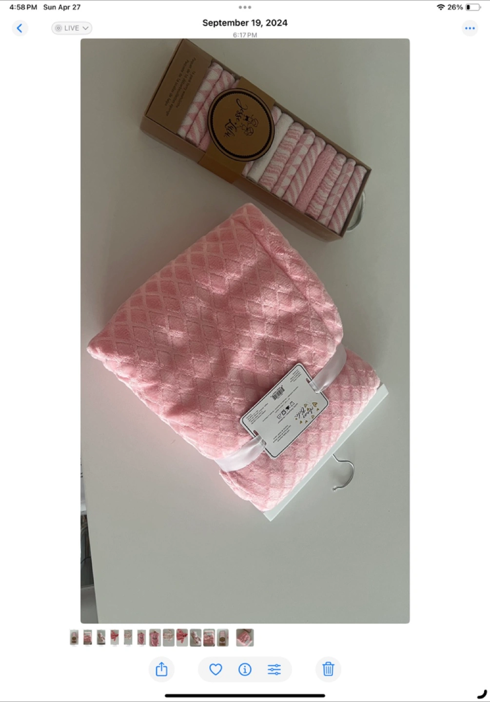 86Adorable pink baby blanket featuring a diamond pattern. Soft and cozy. Includes a matching set of washcloths. Perfect for a baby shower gift.