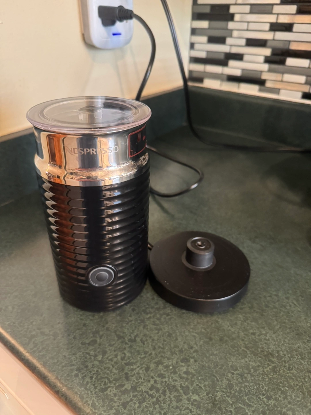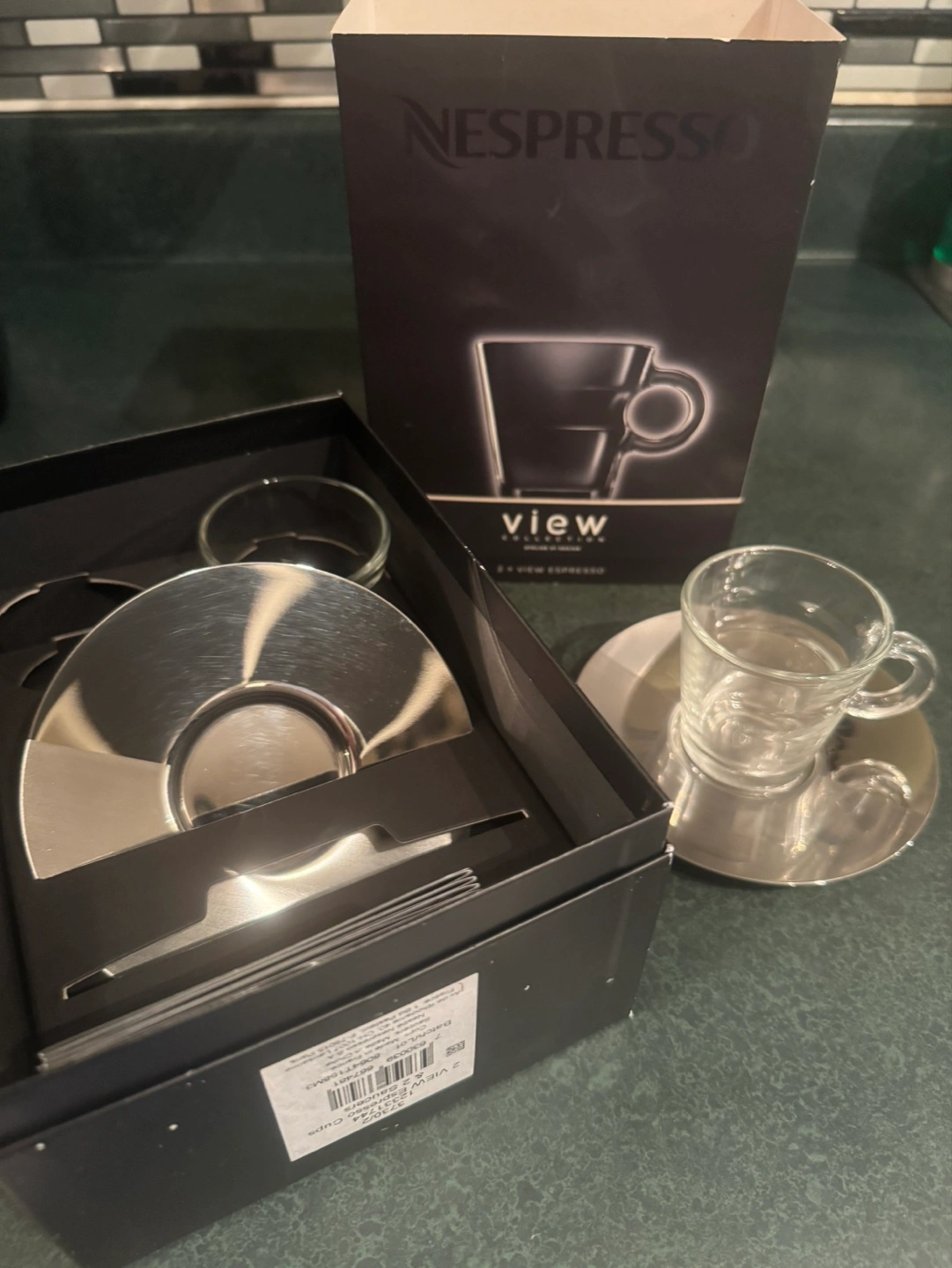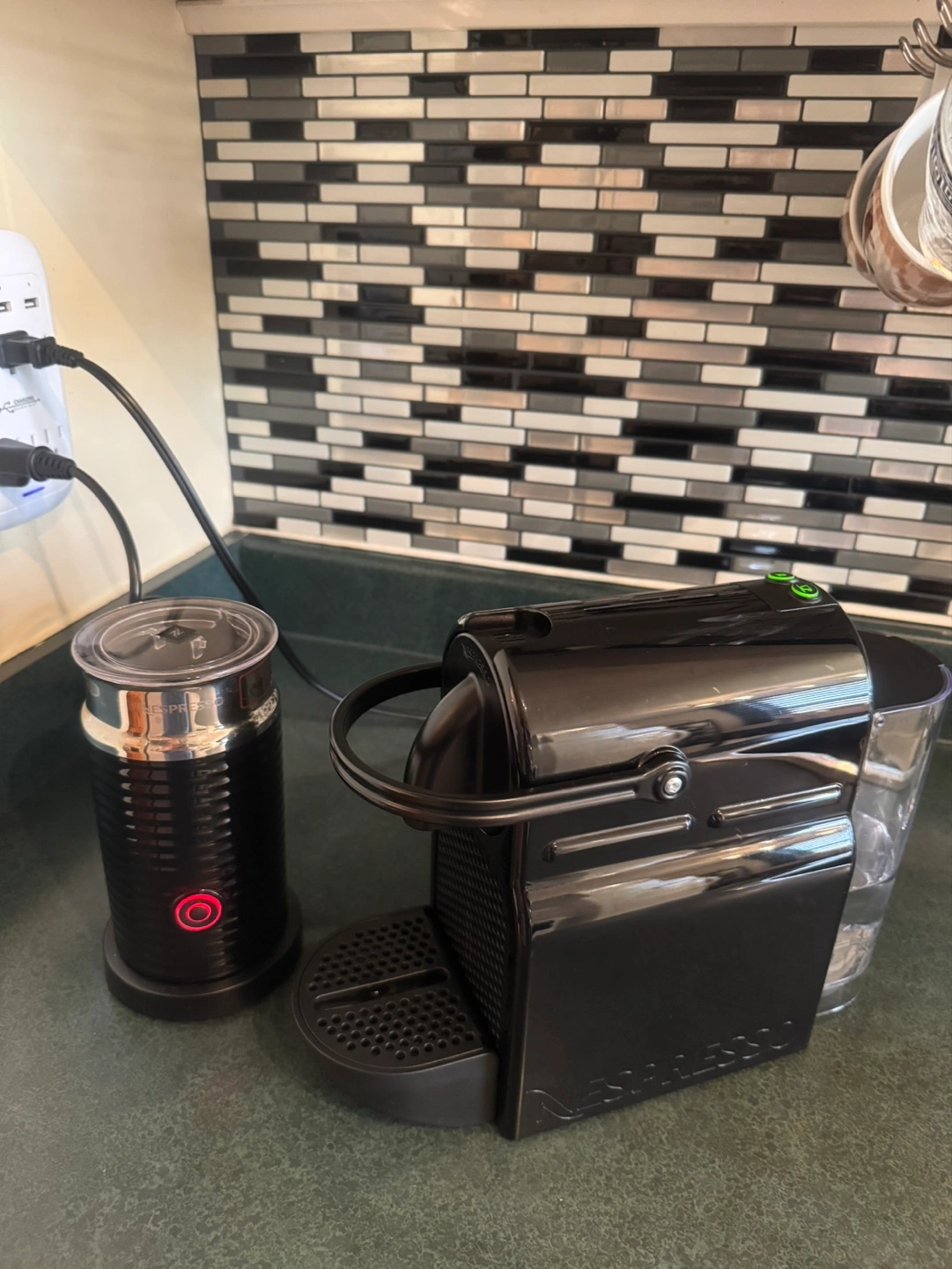 Compact espresso machine. Makes delicious espresso and lungo. Simple to use. Includes a milk frother and brand new two espresso cups and saucers.