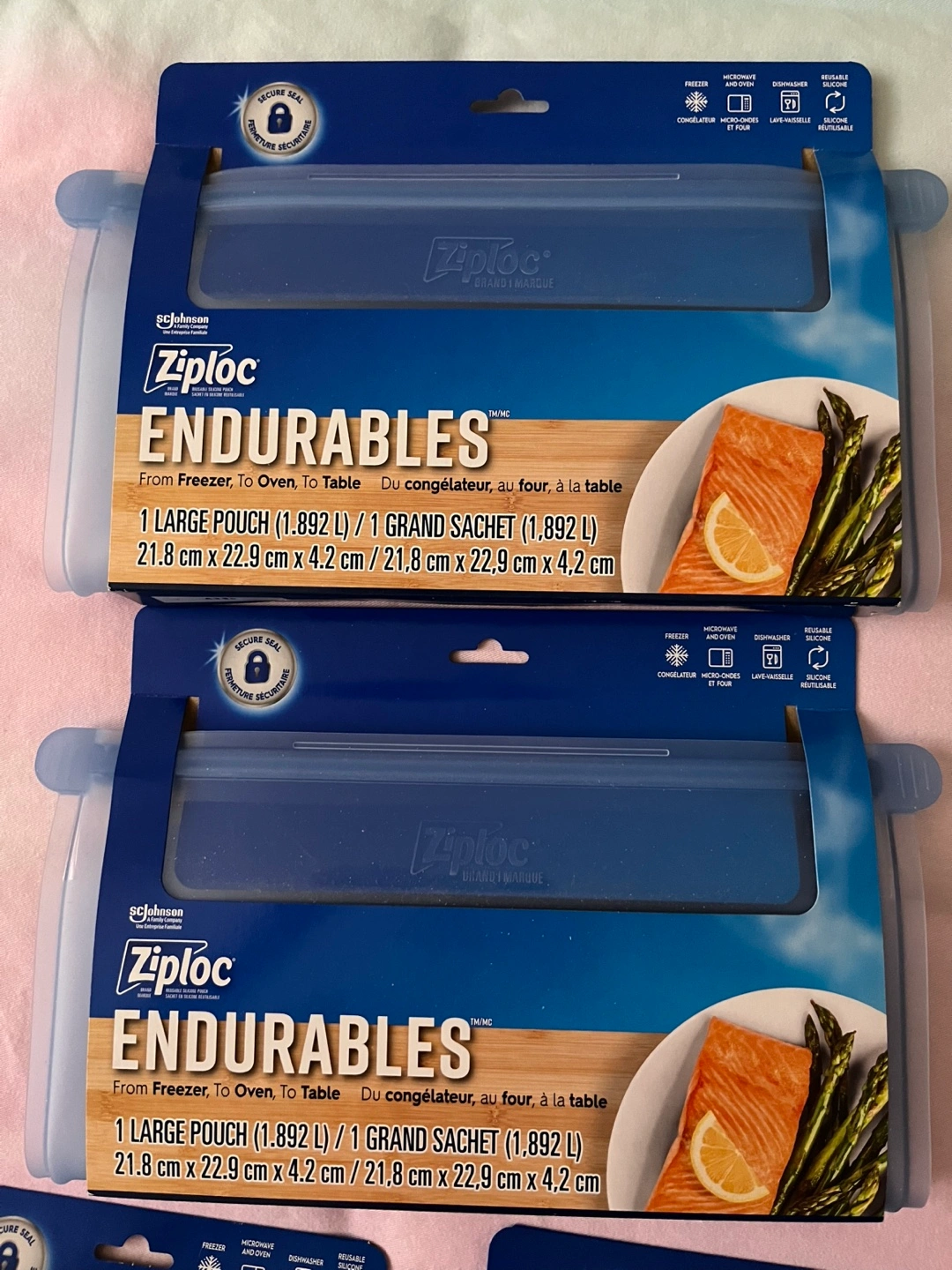 Brand new ,Reusable silicone food pouches. Freezer, oven, and microwave safe. Dishwasher safe. Large size, 1.892 L. Measures 21.8 cm x 22.9 cm x 4.2 cm.
