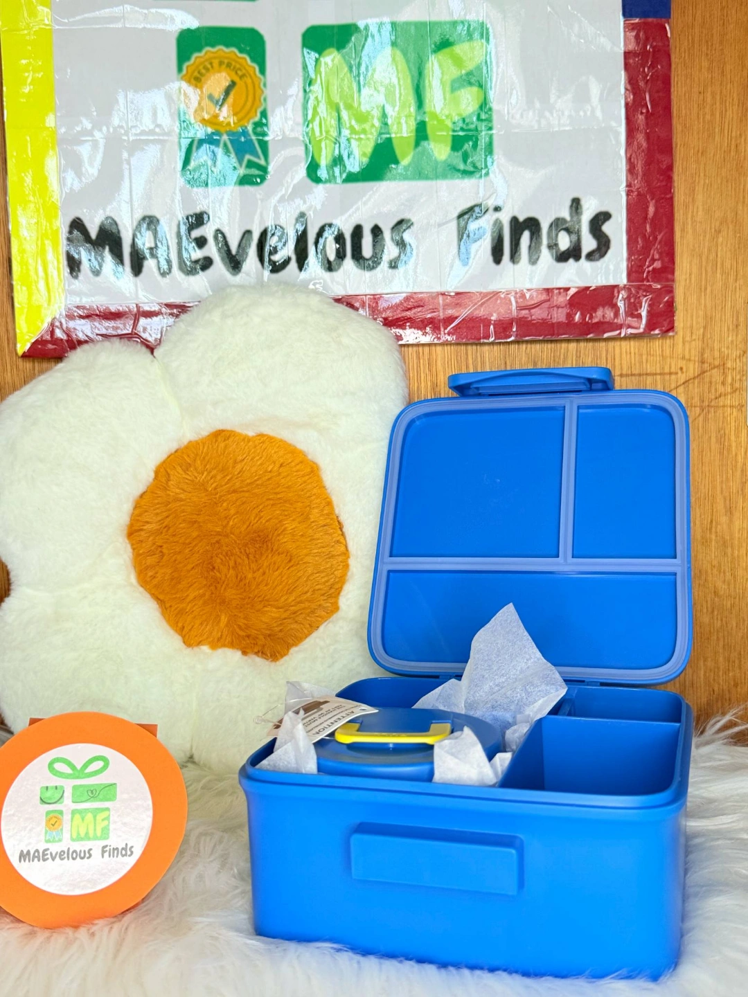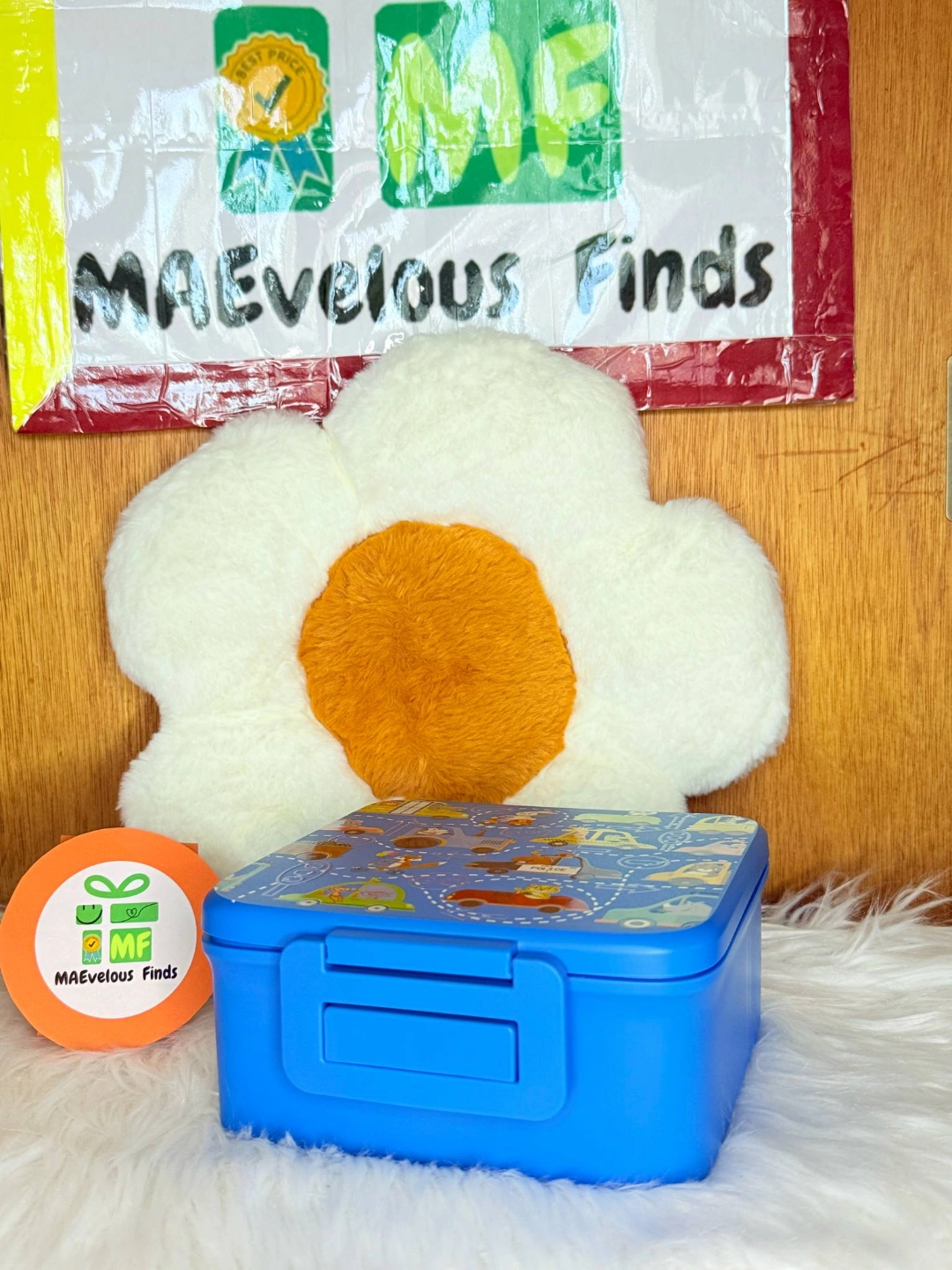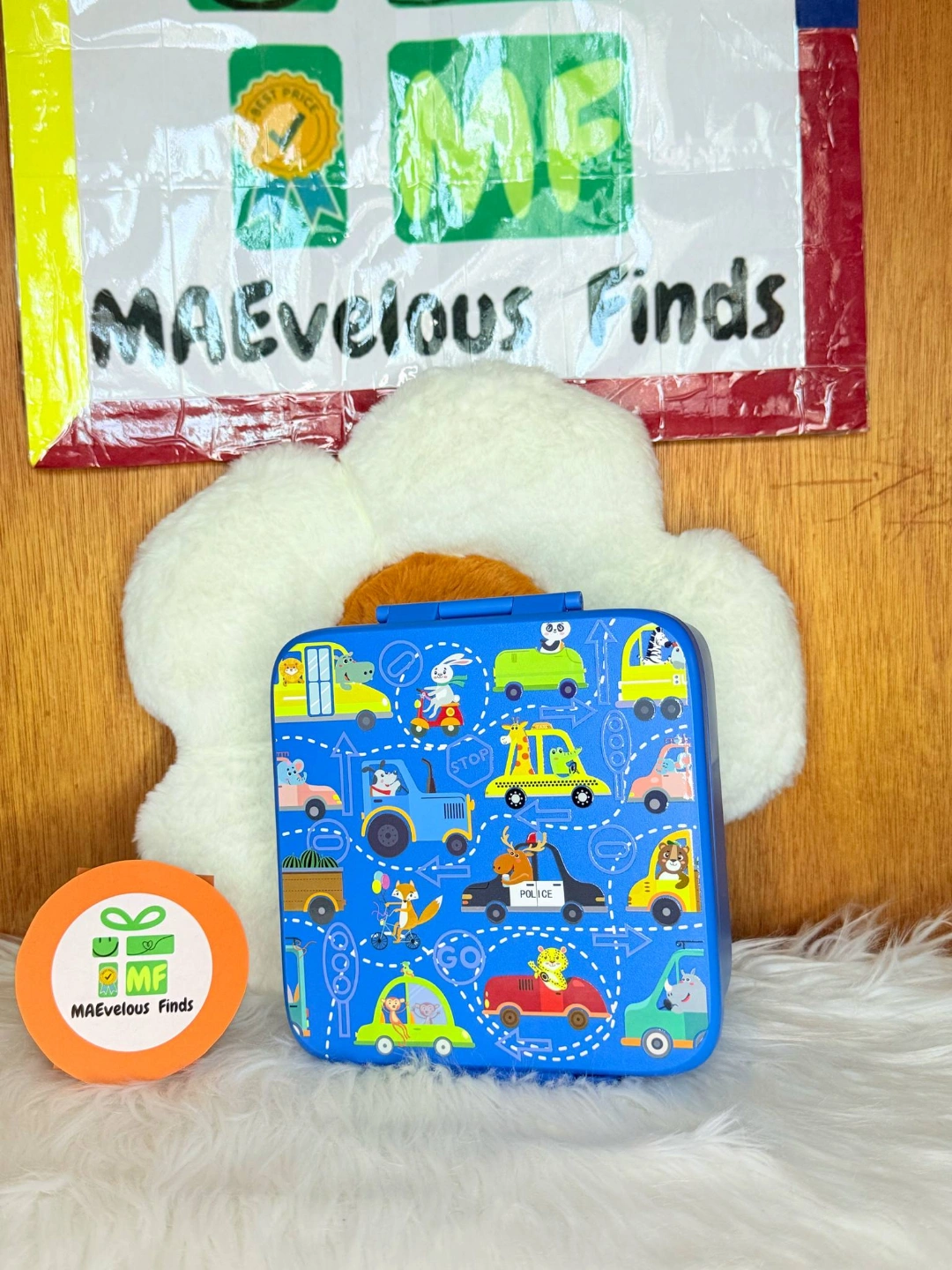 Adorable kids' lunchbox set. Features a divided bento box, perfect for packing a variety of foods. Includes a separate stainless steel thermal food jar. Blue with fun vehicle and animal print. Great for school or outings.