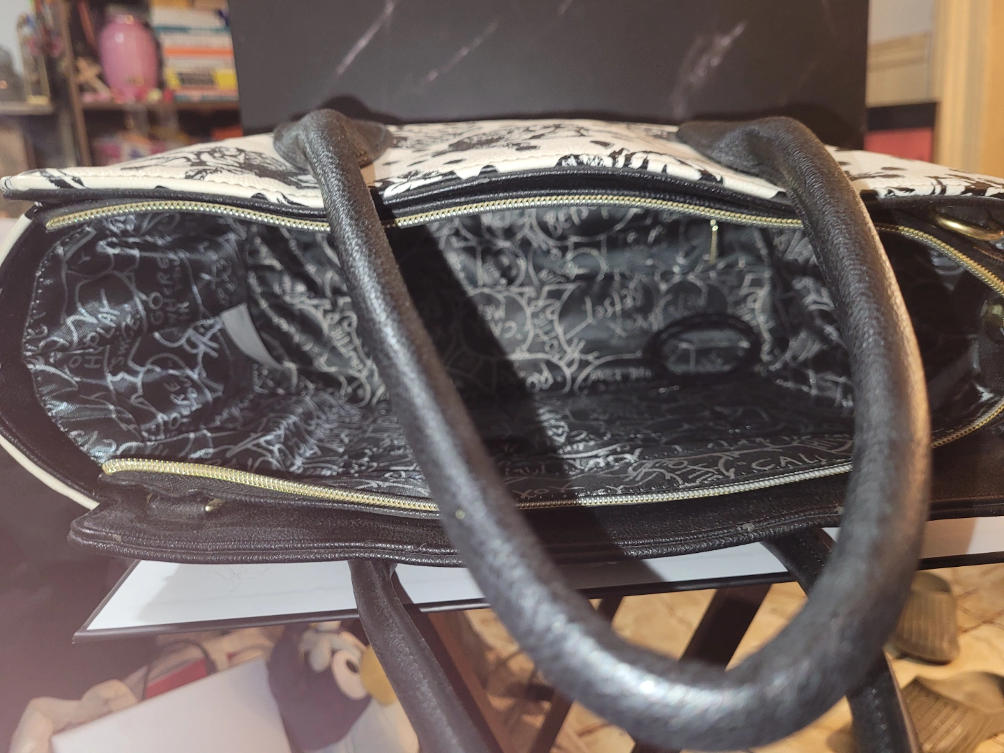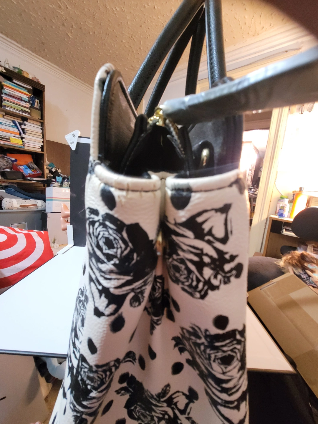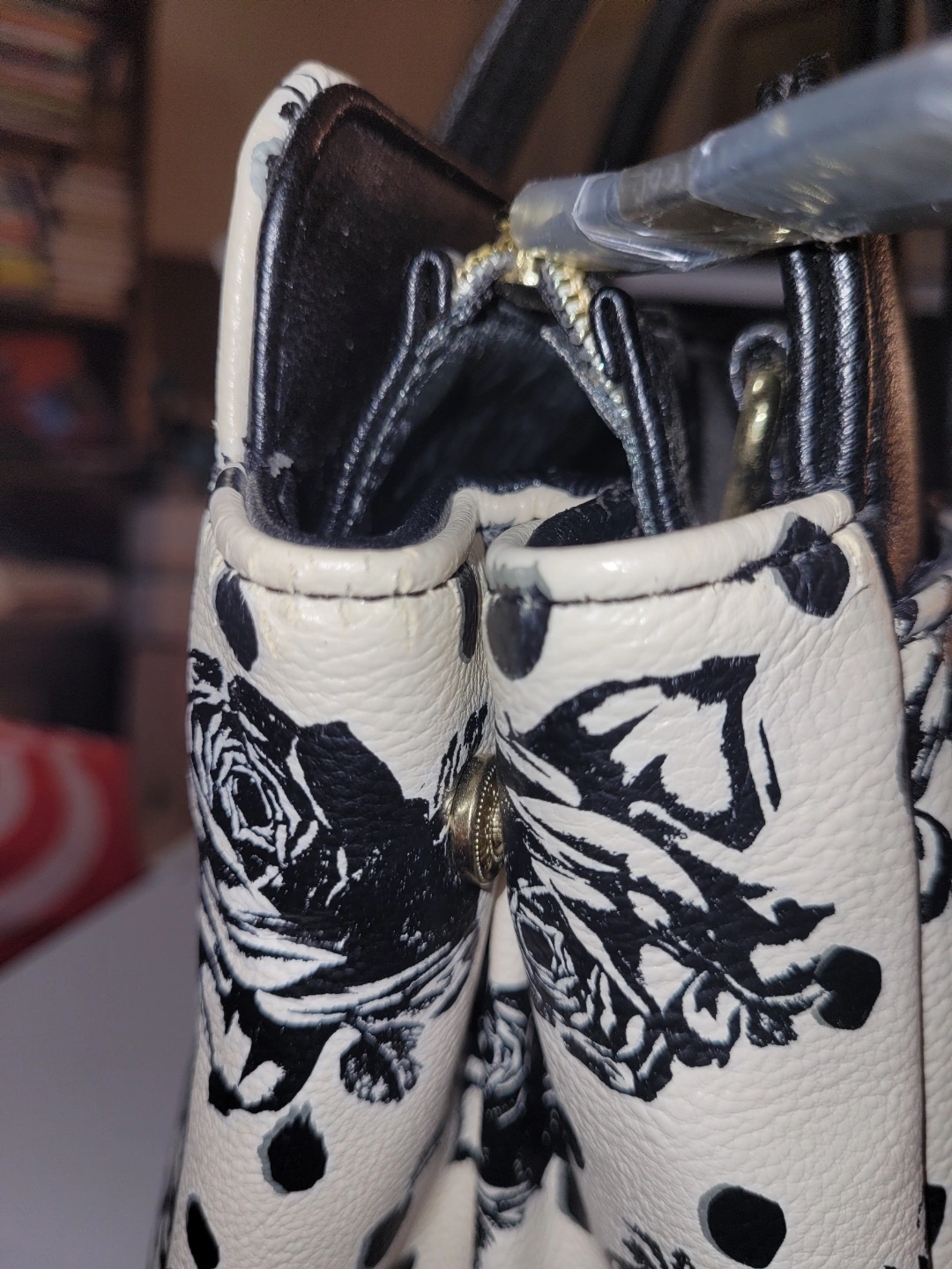 Black and white rose print tote bag. Features two top handles and a zip closure. Polka dots accent the rose print. Black faux leather trim.