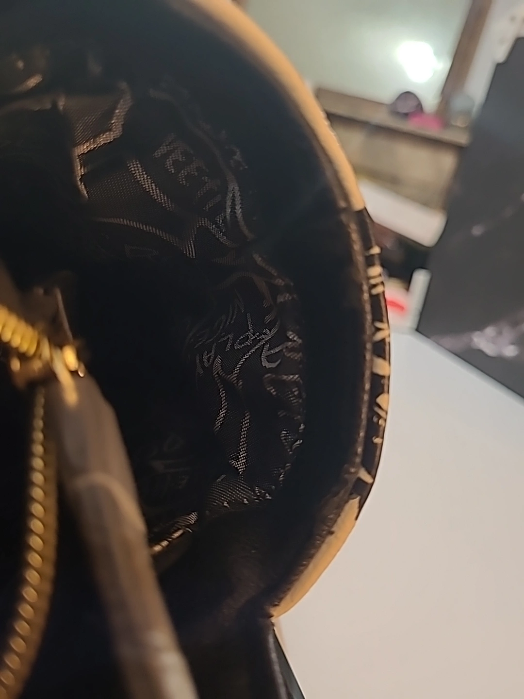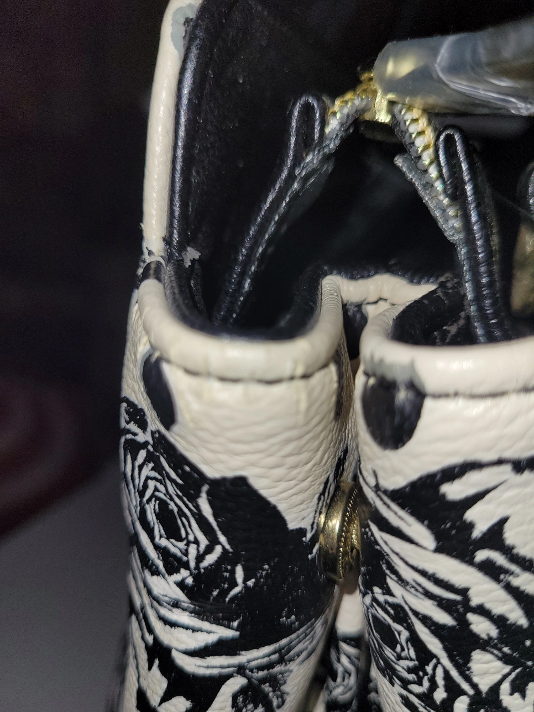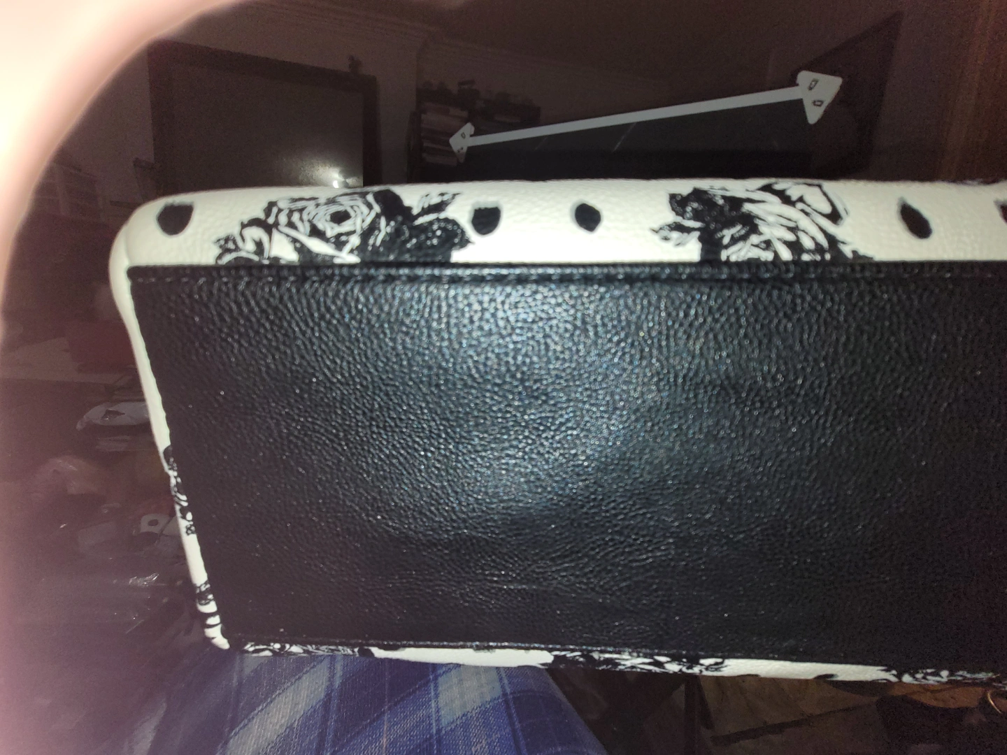 Black and white rose print tote bag. Features two top handles and a zip closure. Polka dots accent the rose print. Black faux leather trim.
