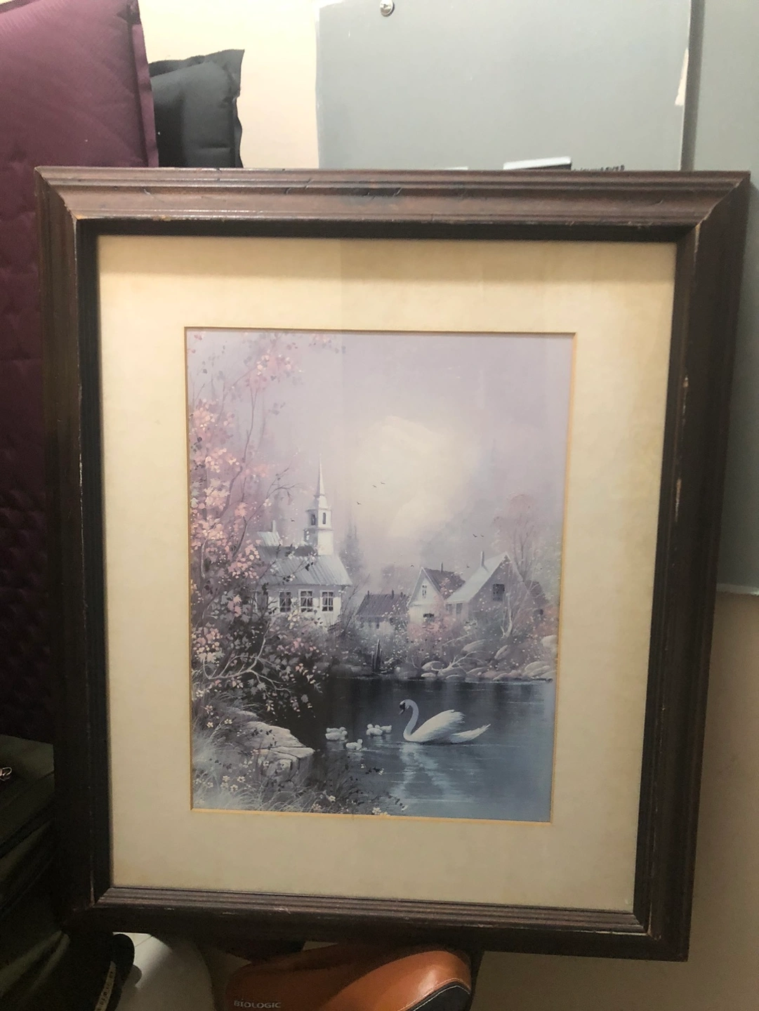 Lovely framed print. Features a swan and cygnets on a lake beside a quaint village. Dark brown frame. Picture is in muted colours.22w&25.5h $30 thanks.