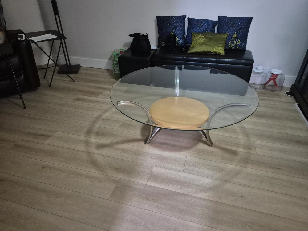 Round glass top coffee table. Chrome-like metal base. Light coloured wood centre. Modern design.