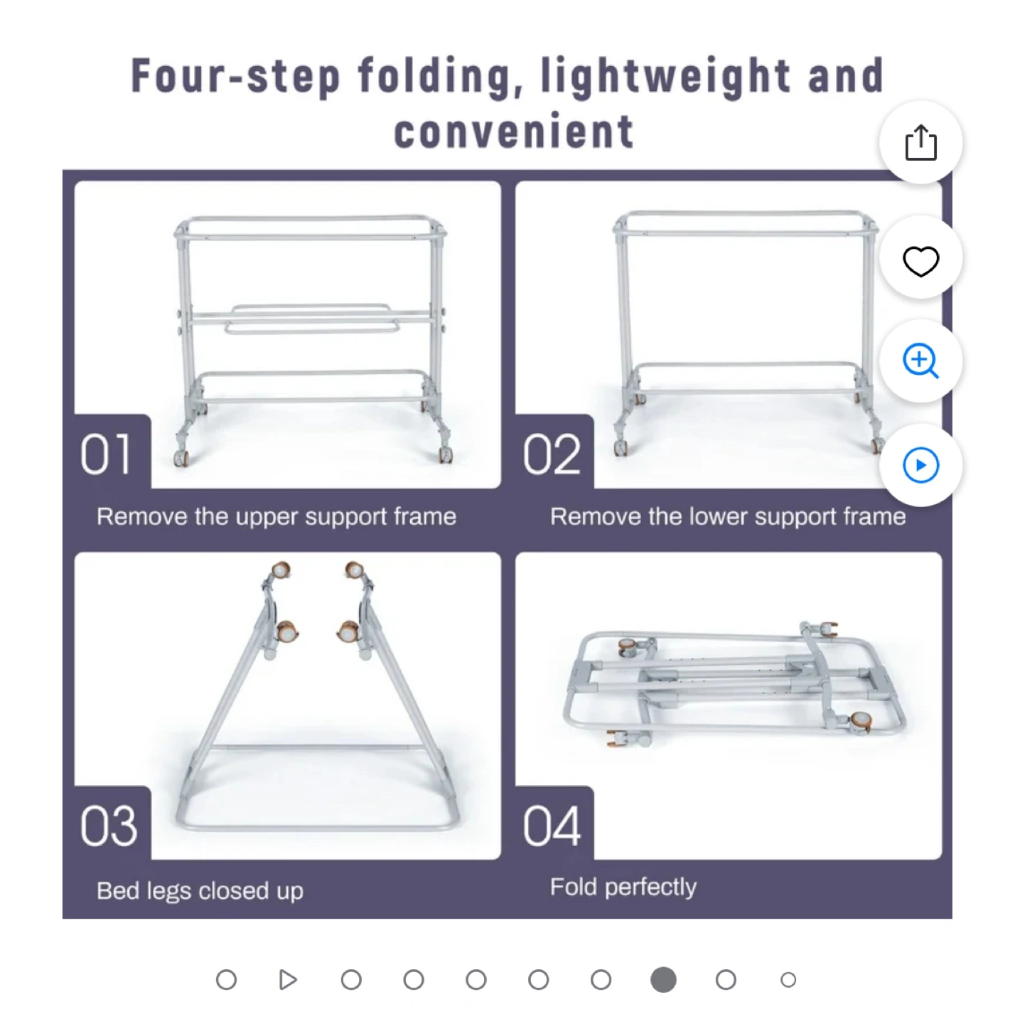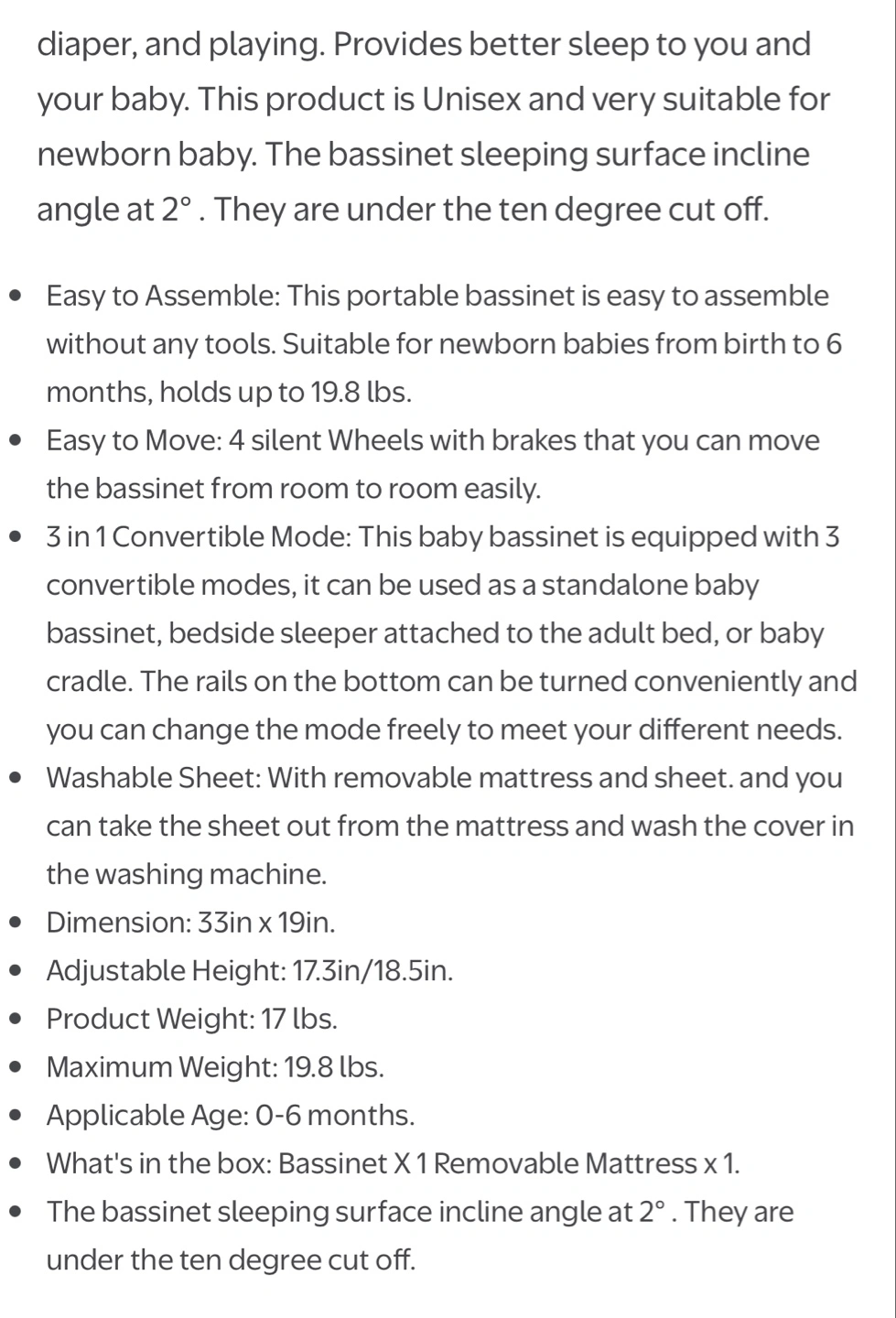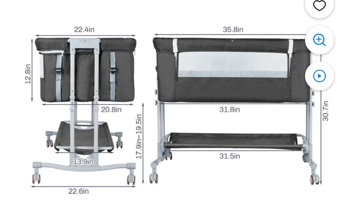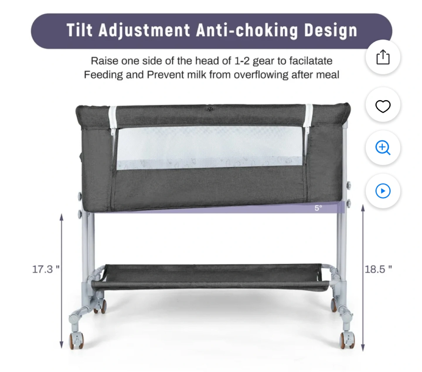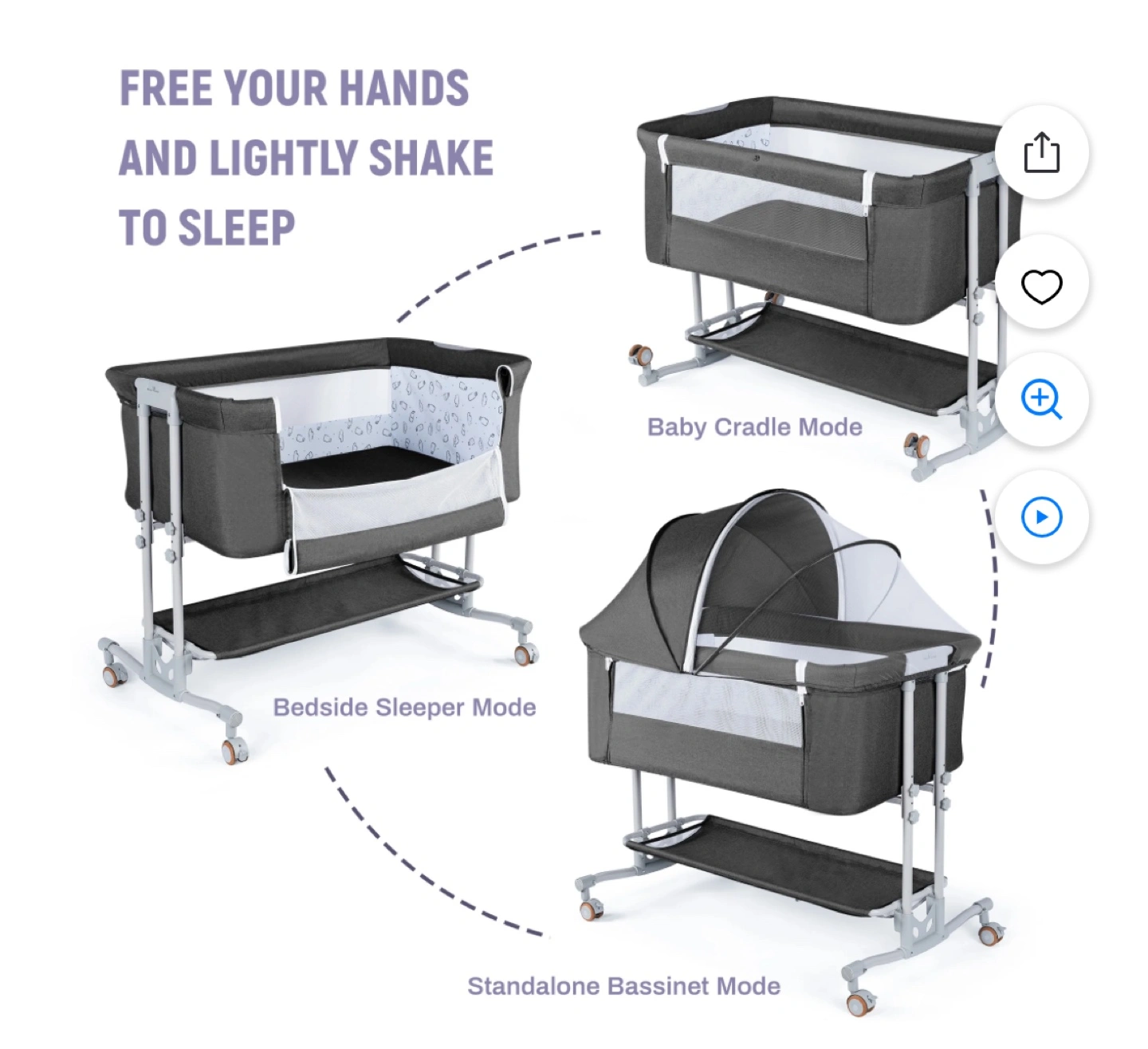 Portable baby bassinet, three modes: bedside sleeper, standalone bassinet, baby cradle. Four-step folding design. Lightweight and convenient. Includes tilt adjustment for anti-choking. Gray fabric with white accents. Storage shelf included.