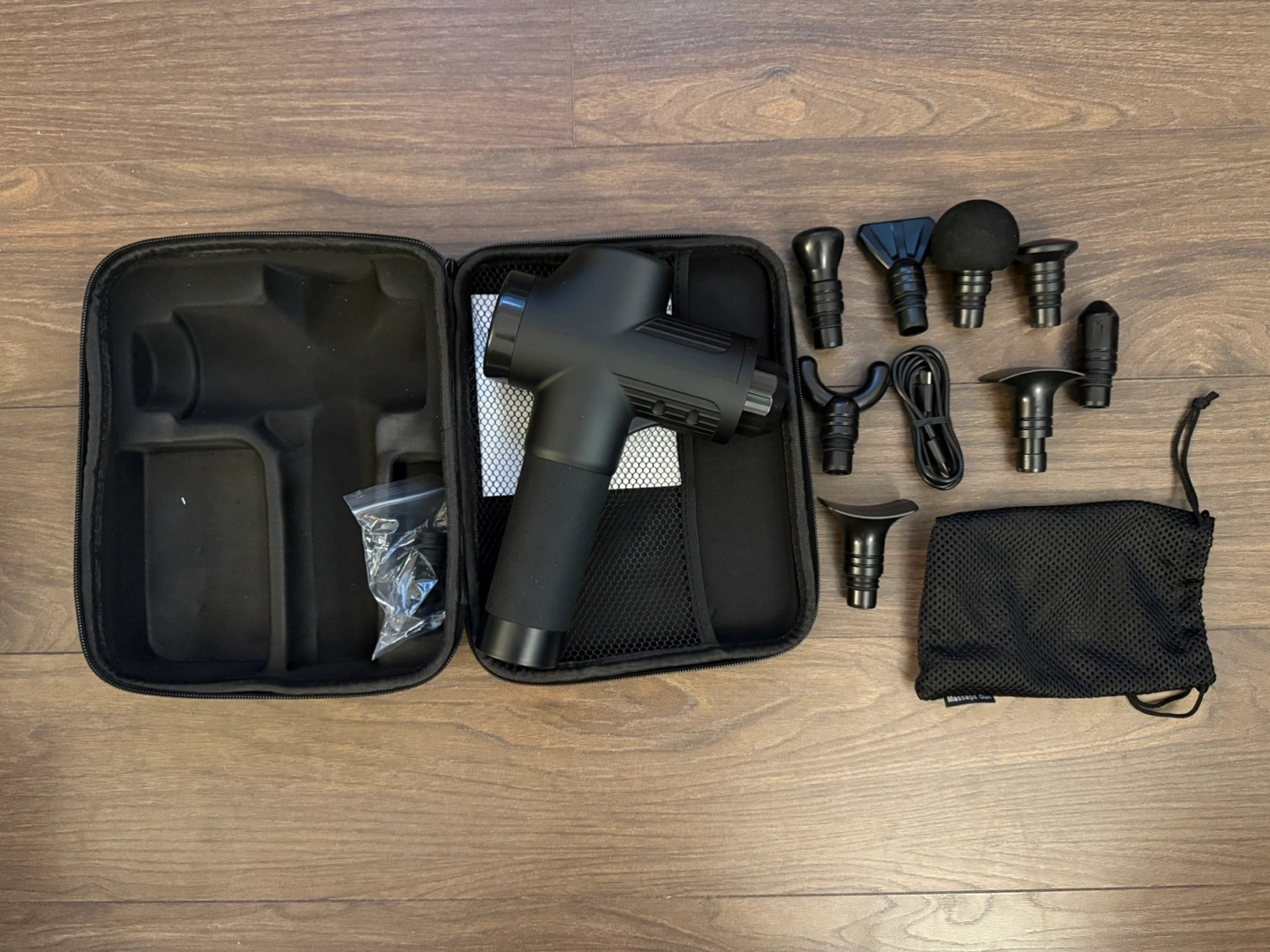 Portable massage gun. Multiple speed settings and various massage heads included. Compact carrying case. Great for muscle recovery. With all original charging wire, massage head and accessories.