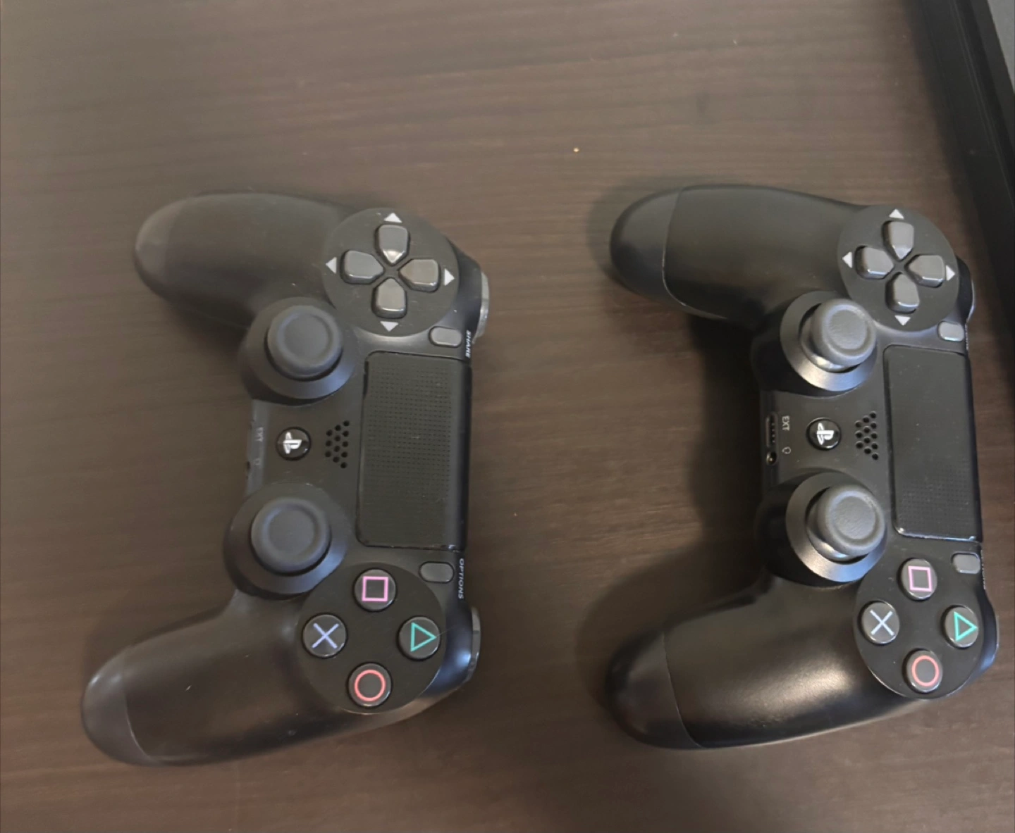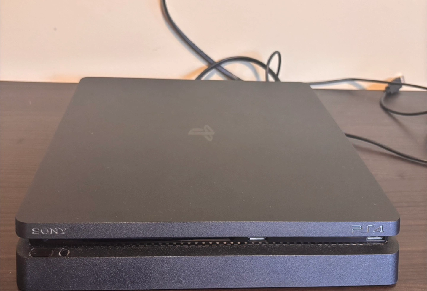 Sony PlayStation 4 Slim console. Includes two black wireless controllers. Power cord included. Pre-owned.