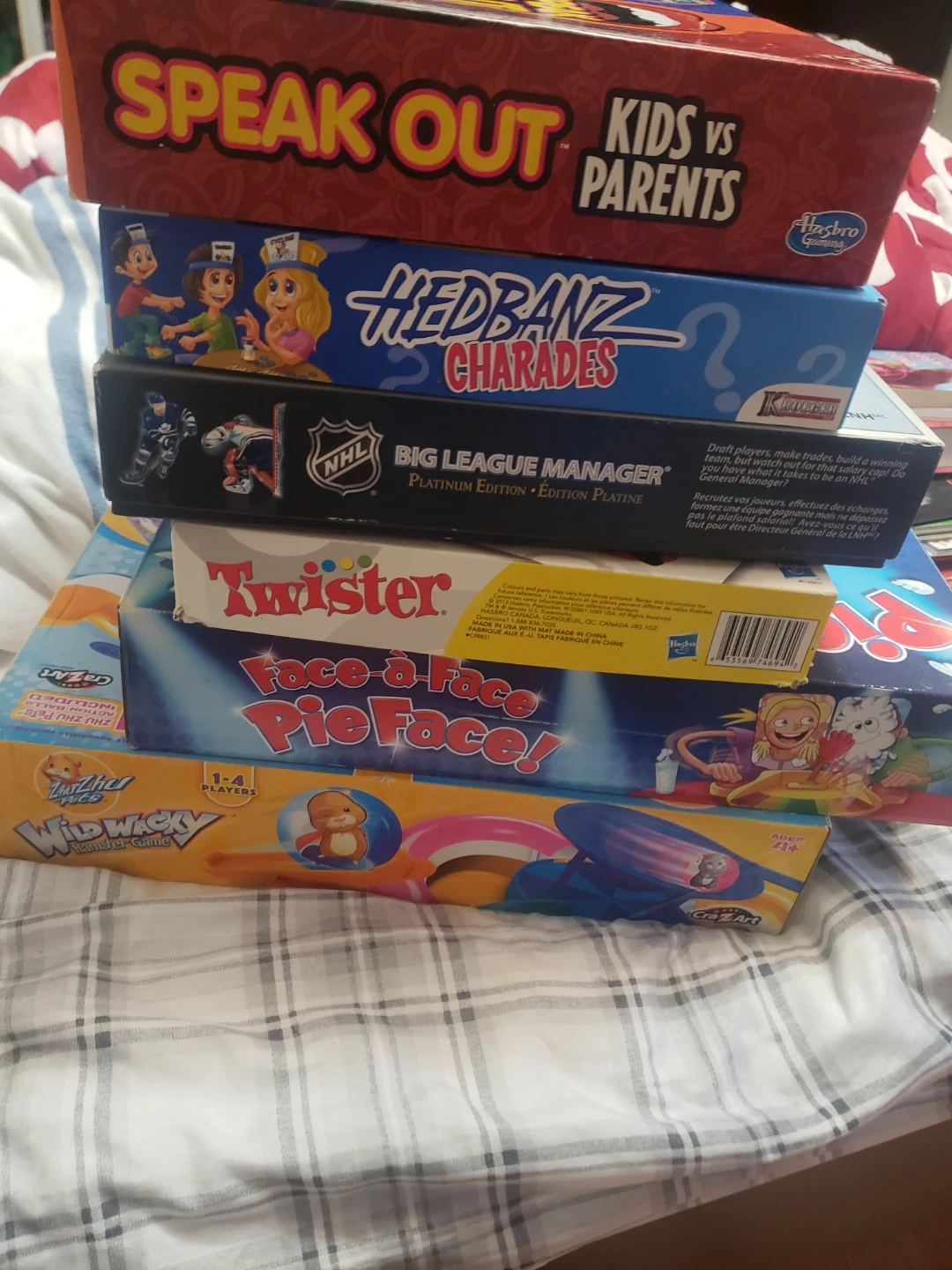 Bundle of five family-friendly board games. Includes Speak Out Kids vs Parents, Hedbanz Charades, NHL Big League Manager Platinum Edition, Twister, and Face-à-Face Pie Face. Great for game night!