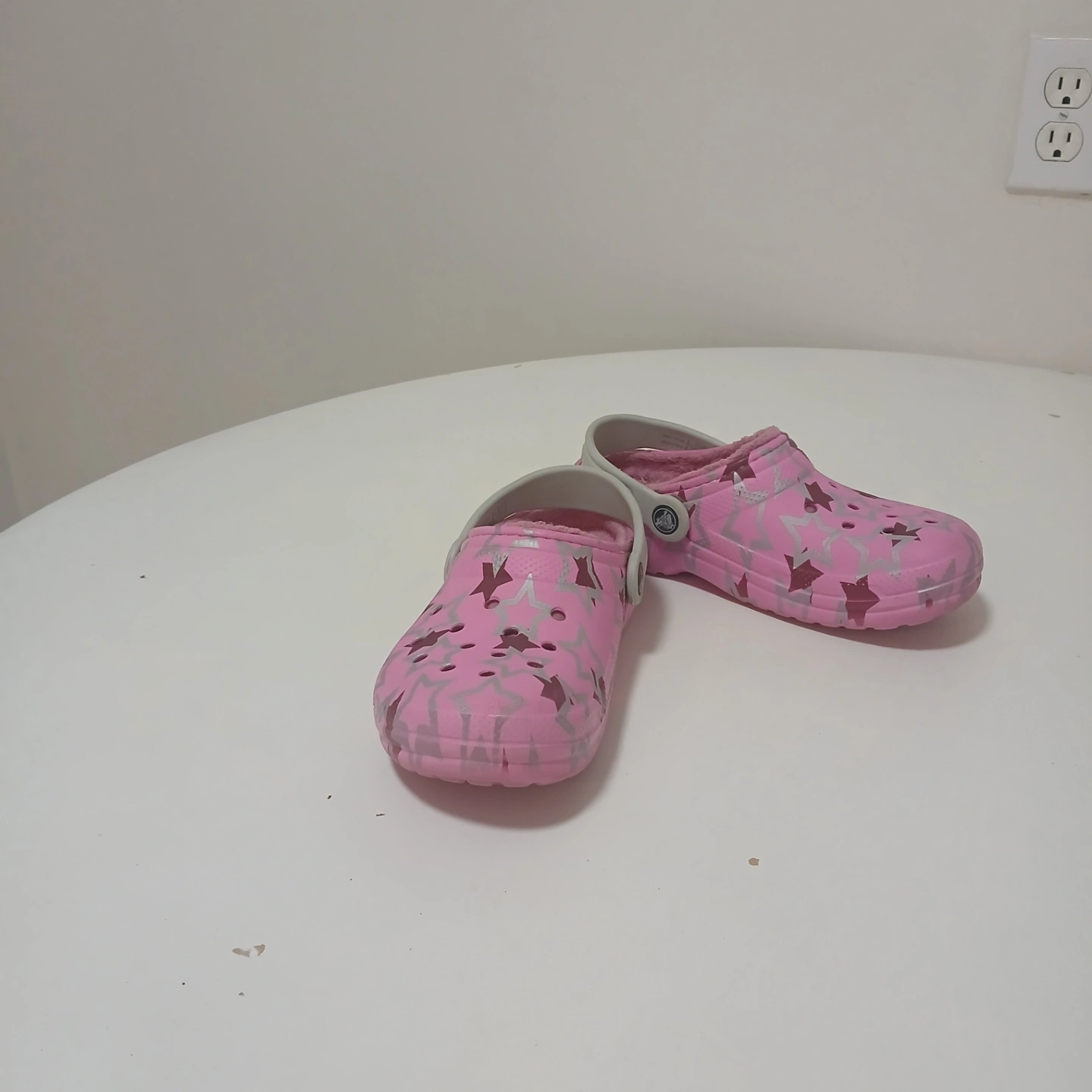 Kids' size pink Crocs clogs. Features a star pattern. Lined with fuzzy material. size 3