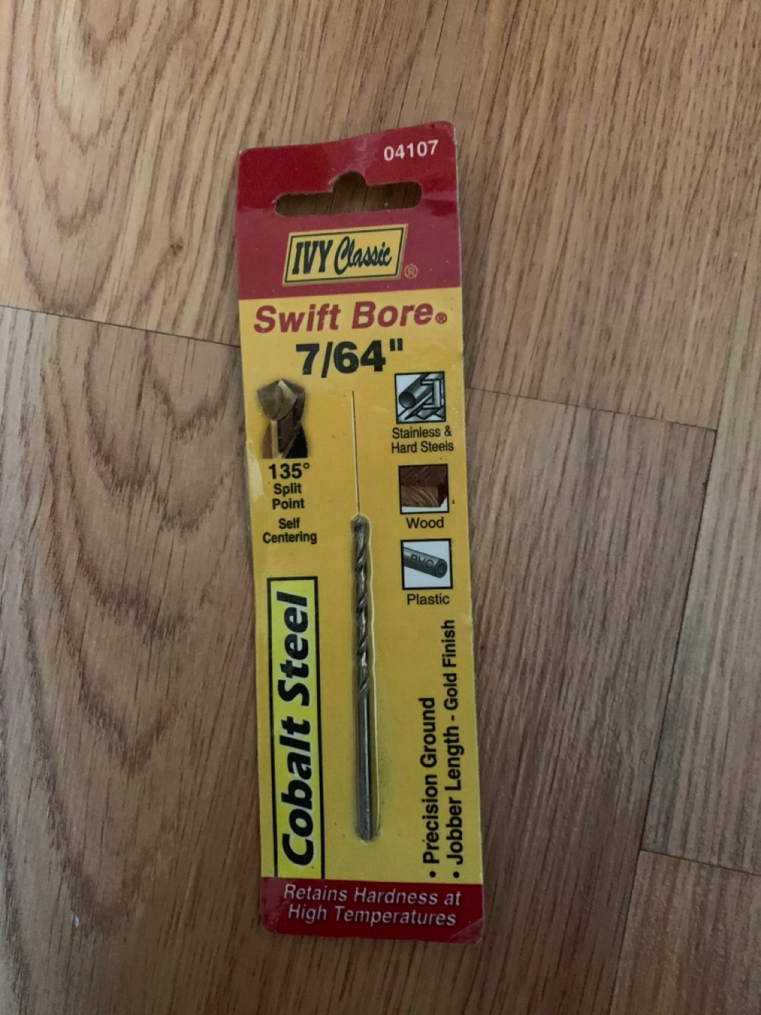 New drill bit. 7/64" size. Cobalt steel. Precision ground. Jobber length. Gold finish. 135° split point, self-centering. Works on wood, plastic, stainless, and hard steels. Retains hardness at high temperatures.