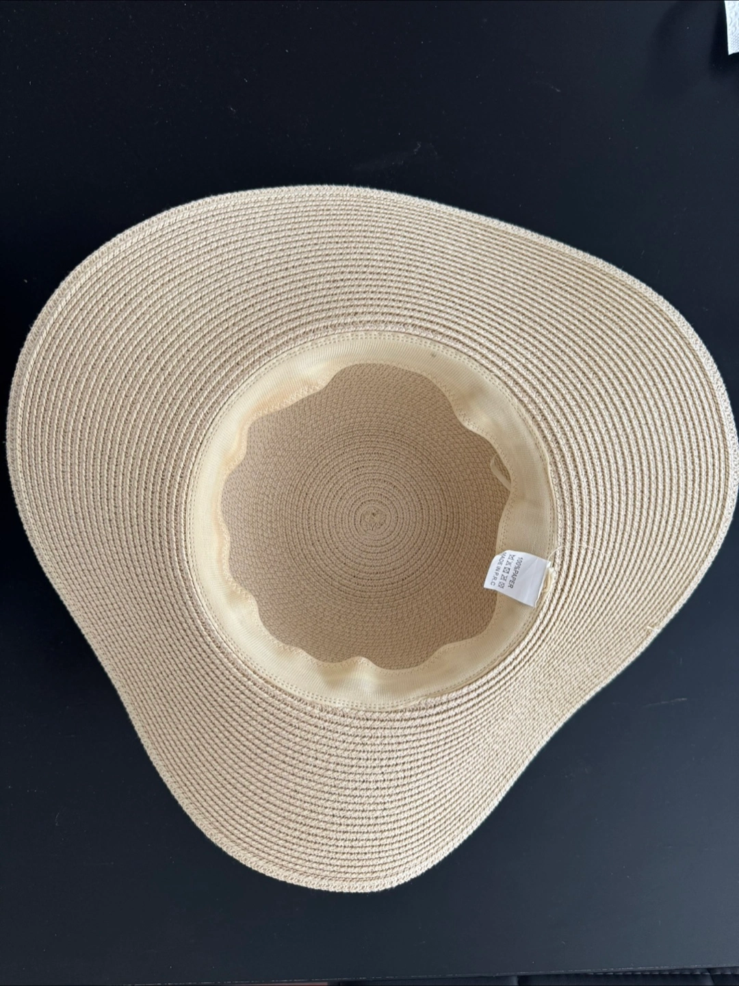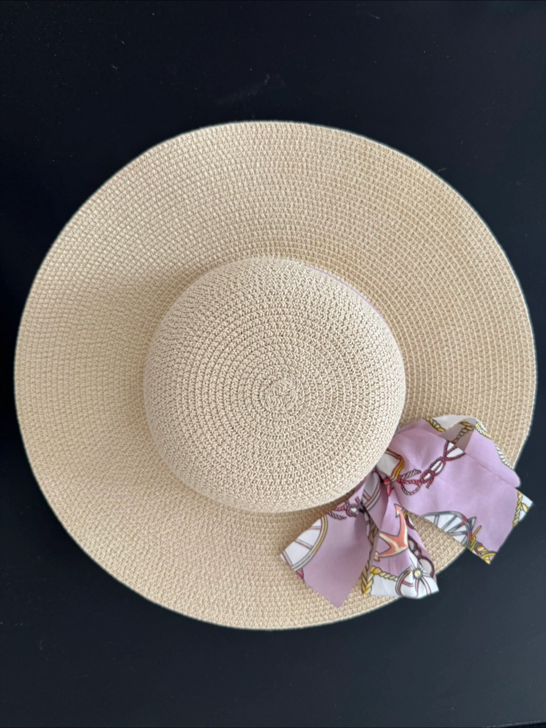 Stylish beige straw sun hat. Features a wide brim and a pretty lilac ribbon accent. Perfect for summer.