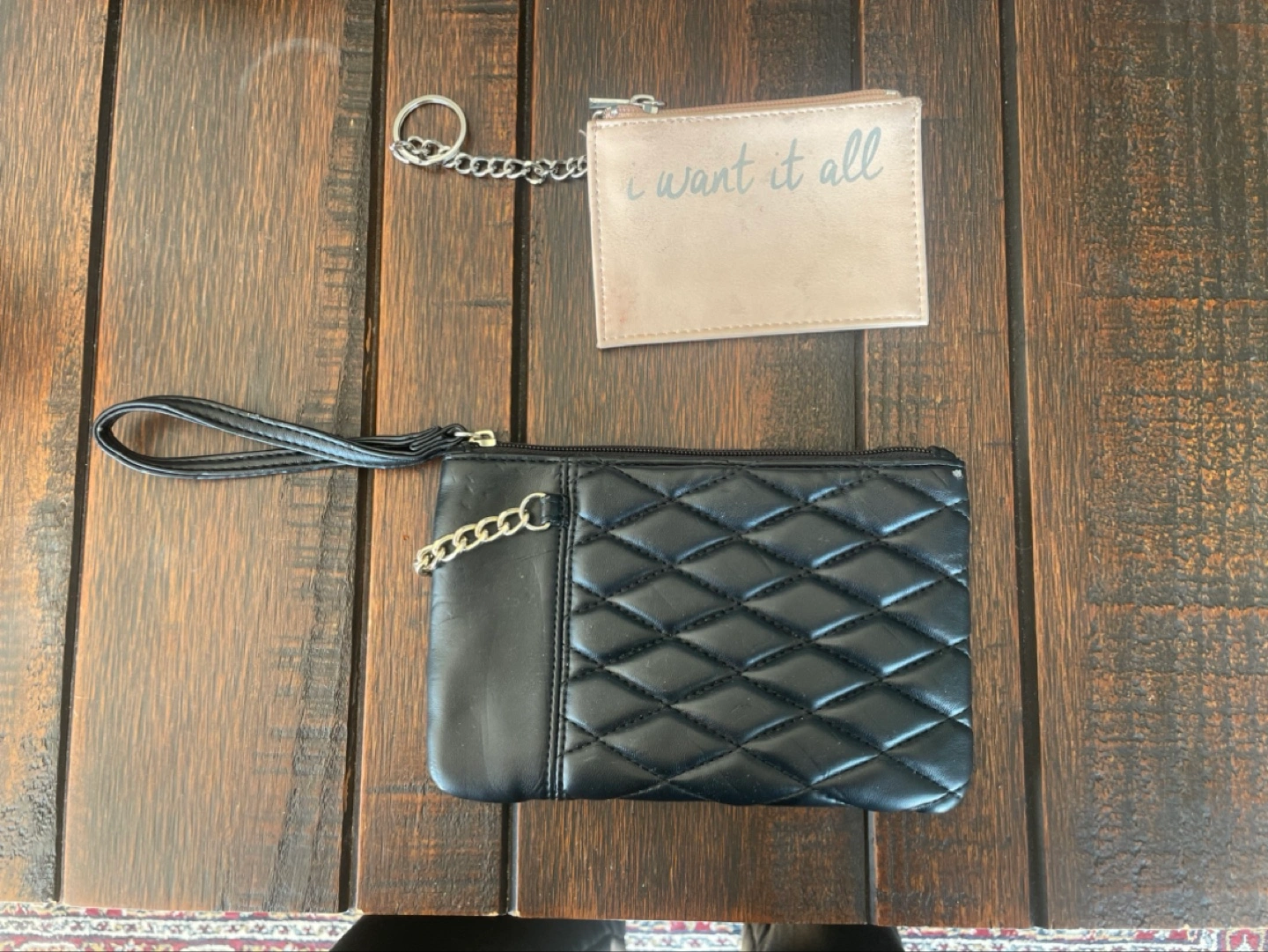 Two small purses. One black quilted purse with a wrist strap and chain detail. One pink coin purse with zipper and keychain. Take one or both.