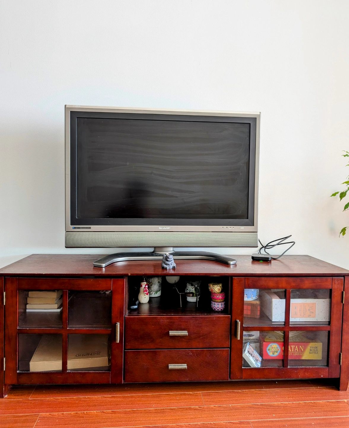 Superior quality, fine wood, cherry-walnut shade TV Table/ Stand/ Console/ Cabinet. I wouldn't have given this away if it went with my new home color scheme. In great shape, and has a lot of storage along with centre hole for wires. Glass cabinet doors are in perfect condition.