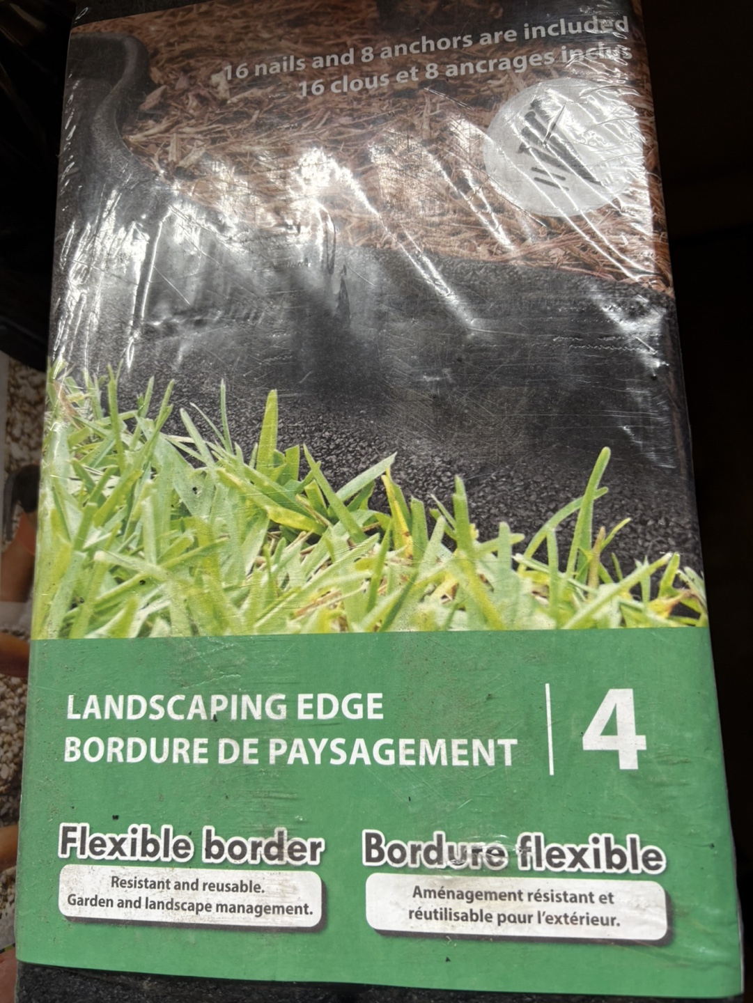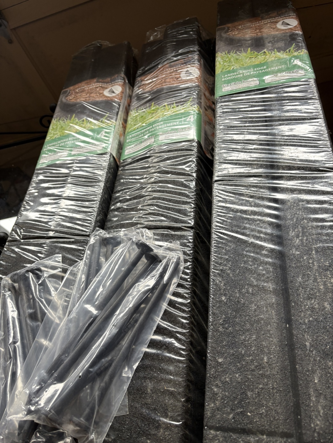 Three New packs of flexible landscaping border. 4 borders per pack. Reusable and resistant. Quick installation. Includes 16 nails and 8 anchors per pack. Garden and landscape management.