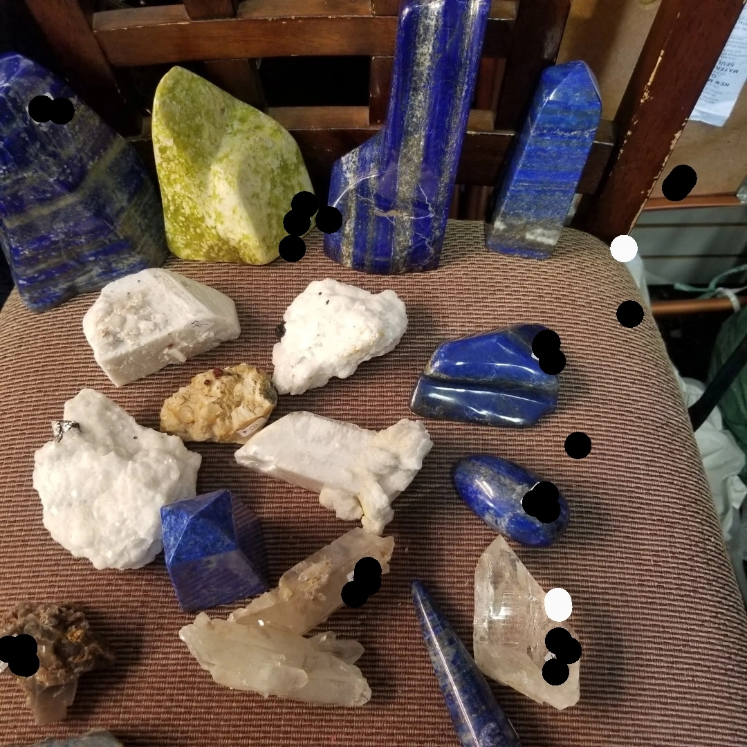 Variety of crystals and stones. Includes polished lapis lazuli, raw quartz, and other specimens. Some are shaped. Great for collectors or metaphysical enthusiasts.
