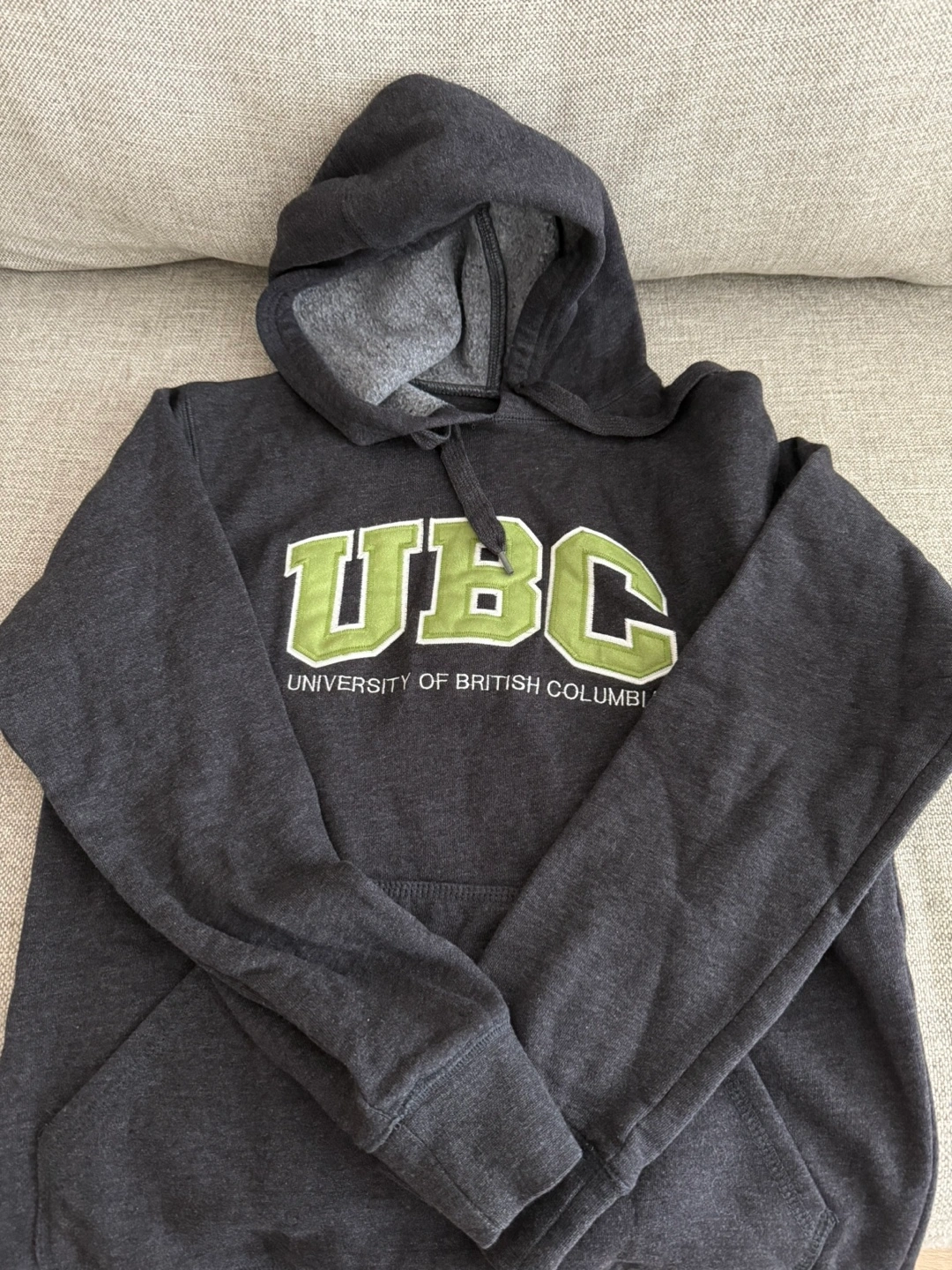 Grey hooded sweatshirt. Features a large UBC logo embroidered on the chest. Drawstring hood and kangaroo pocket.