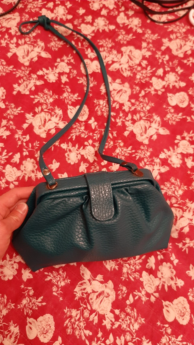 552Small teal crossbody bag. Features a long shoulder strap and a snap closure. Interior features a small pocket.
