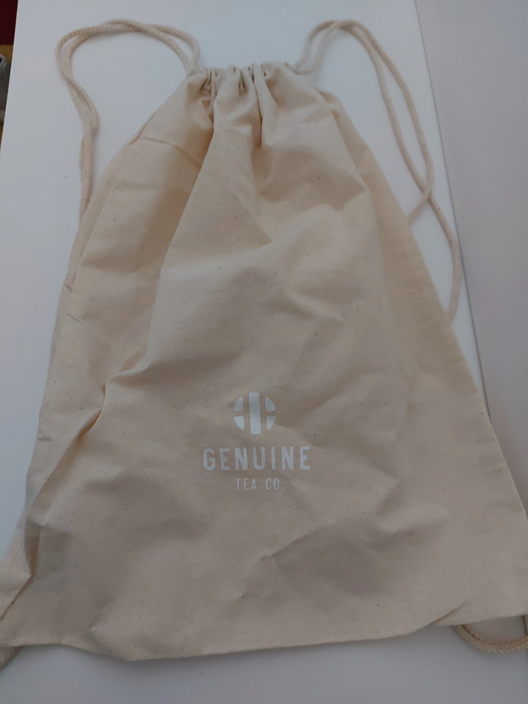 Off-white cotton drawstring bag. Features Genuine Tea Co. logo. Perfect for carrying groceries or other small items.