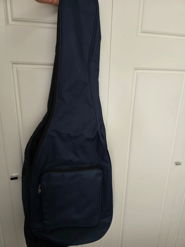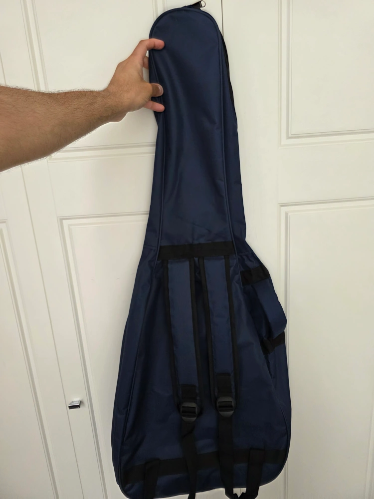 Brand new, durable navy blue gig bag for acoustic guitar. Features padded interior, zippered pocket, and backpack straps.