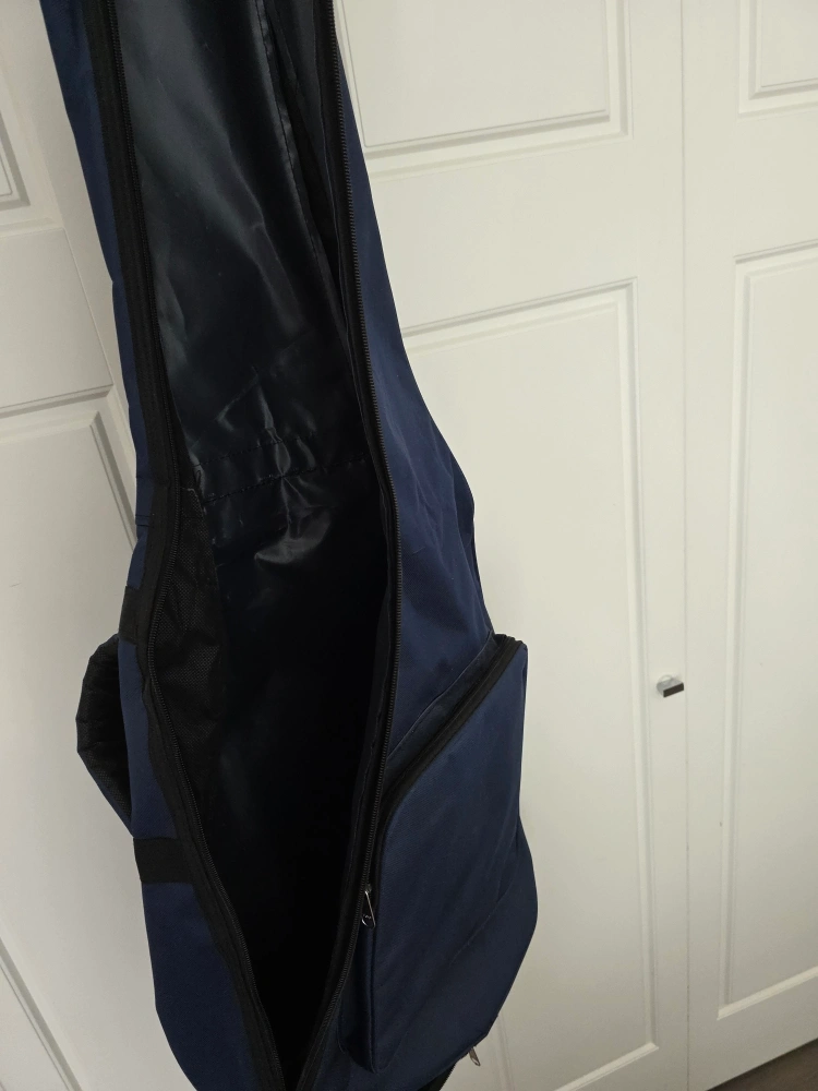 Brand new, durable navy blue gig bag for acoustic guitar. Features padded interior, zippered pocket, and backpack straps.
