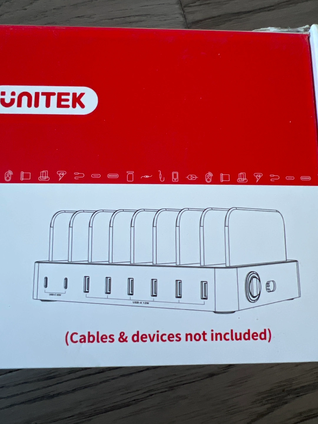 Brand new Unitek 8-Port USB charging station. Charges multiple devices simultaneously. Includes power cord. Cables and devices not included. 75 watts total power output.