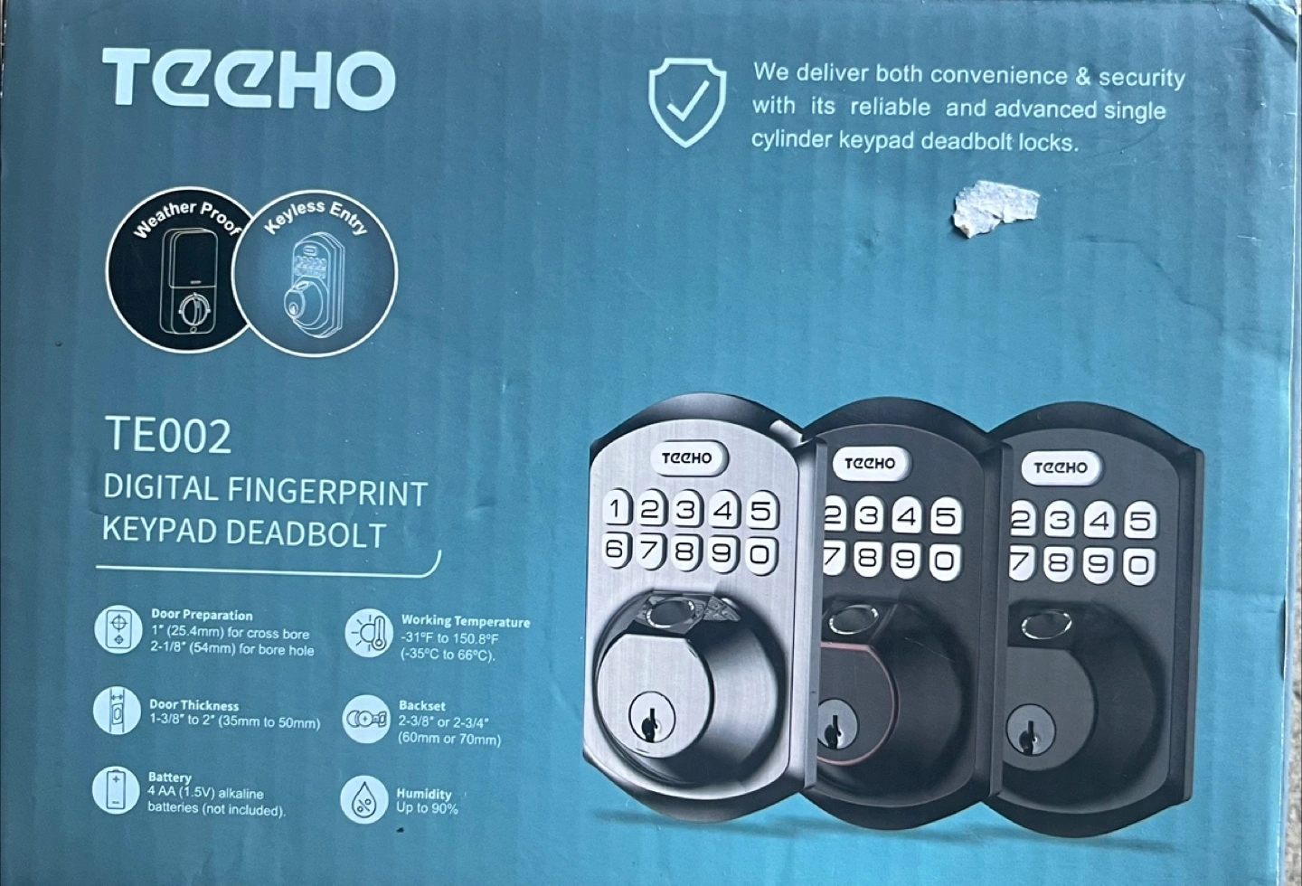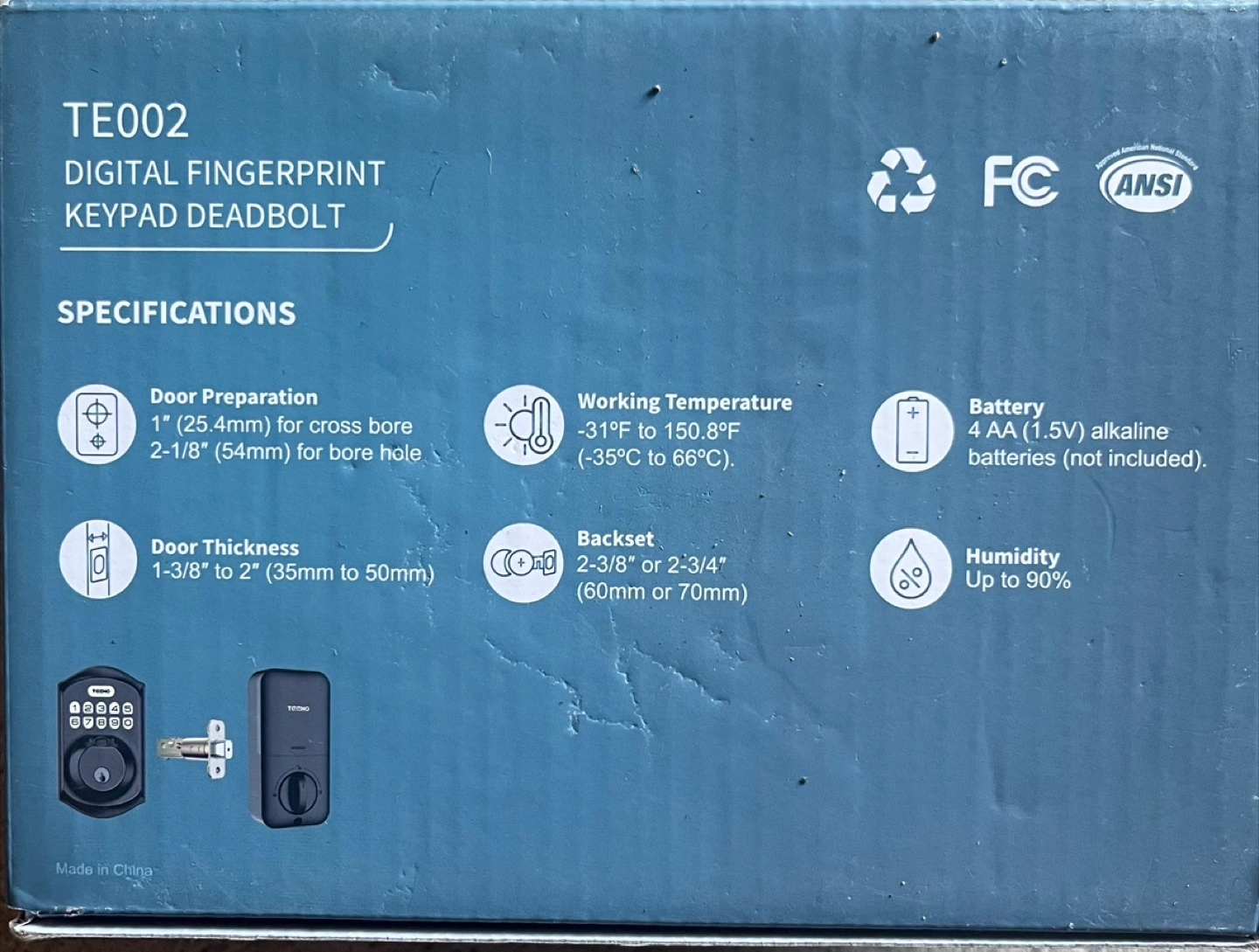 65New in box. Digital keypad deadbolt lock. Satin Nickel, Oil Rubbed Bronze, and Matte Black. Weatherproof and keyless entry. Requires 4 AA 1.5V alkaline batteries (not included). Works in temperatures from -35°C to 66°C. Humidity up to 90%. Made in China.