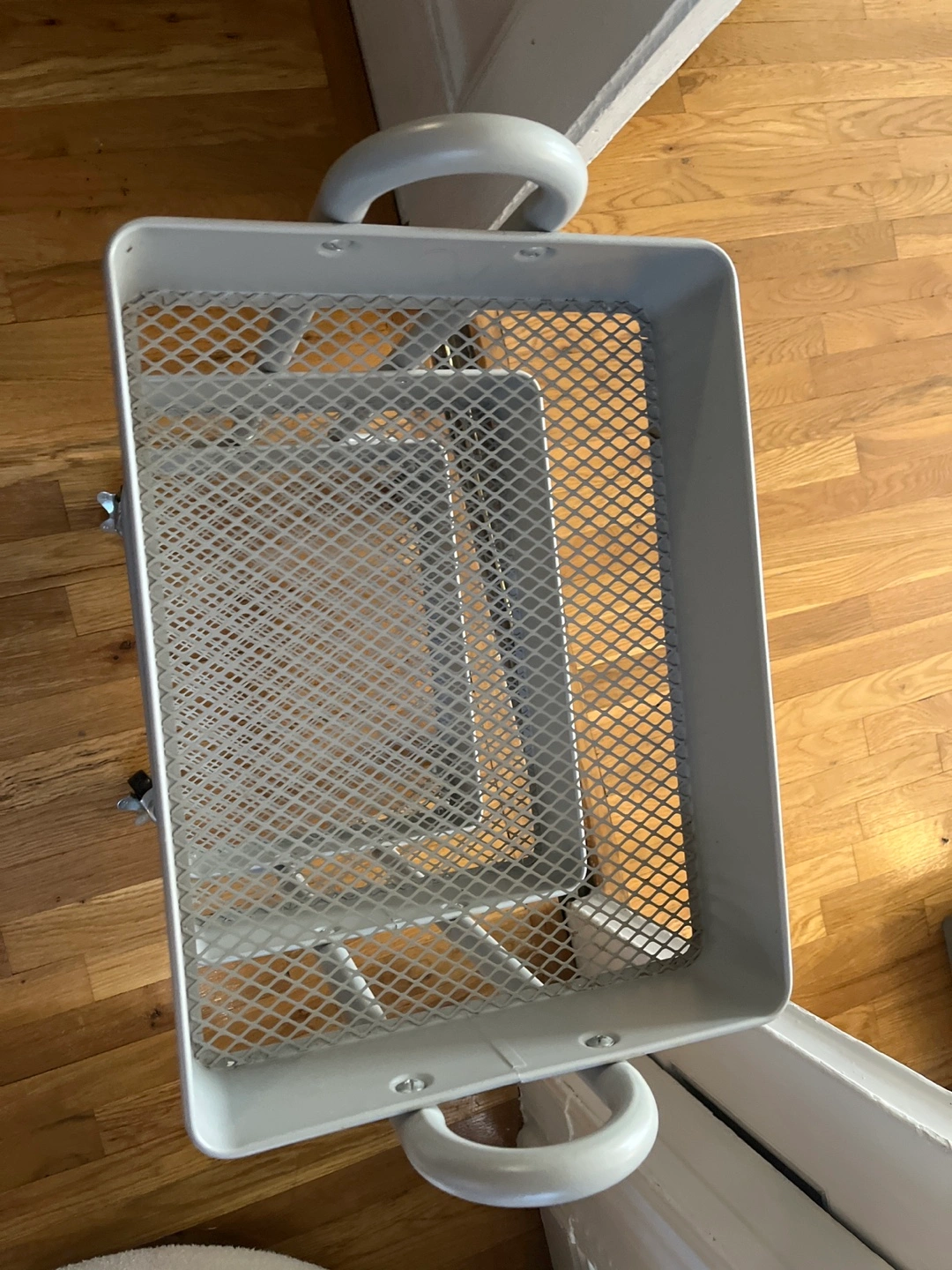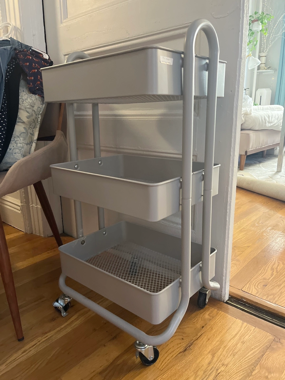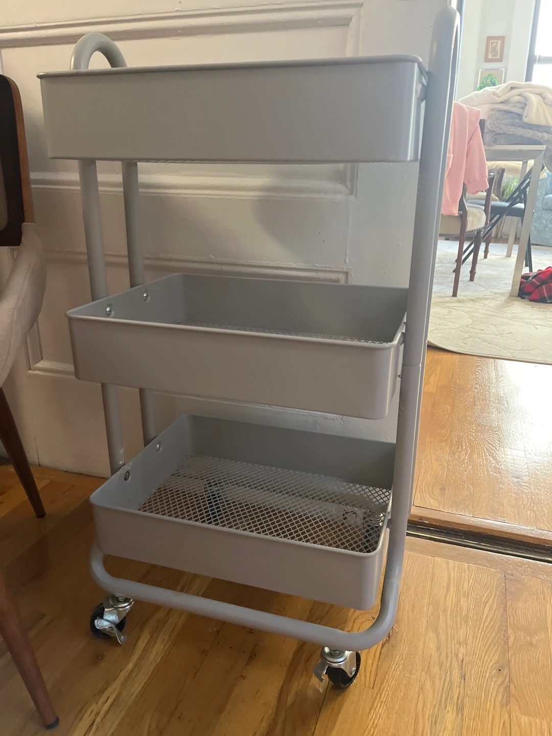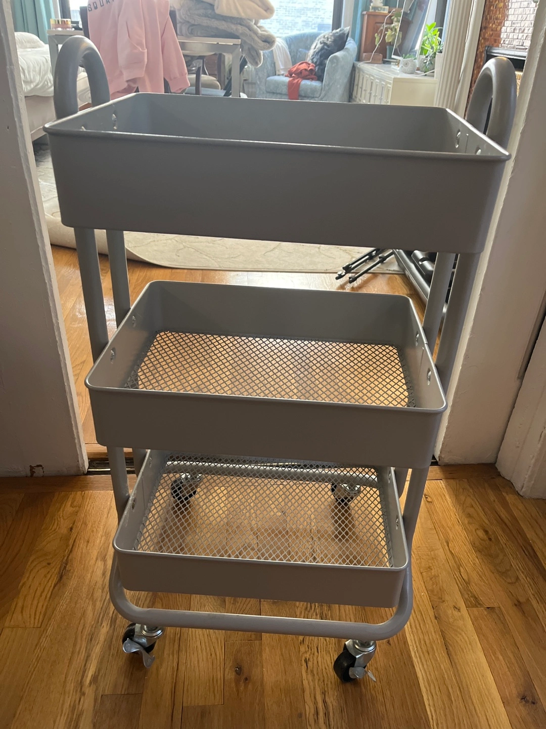 Three-tier rolling cart. Gray metal frame. Two top trays solid, bottom tray mesh. Great for storage and organization. Wheels for easy mobility.