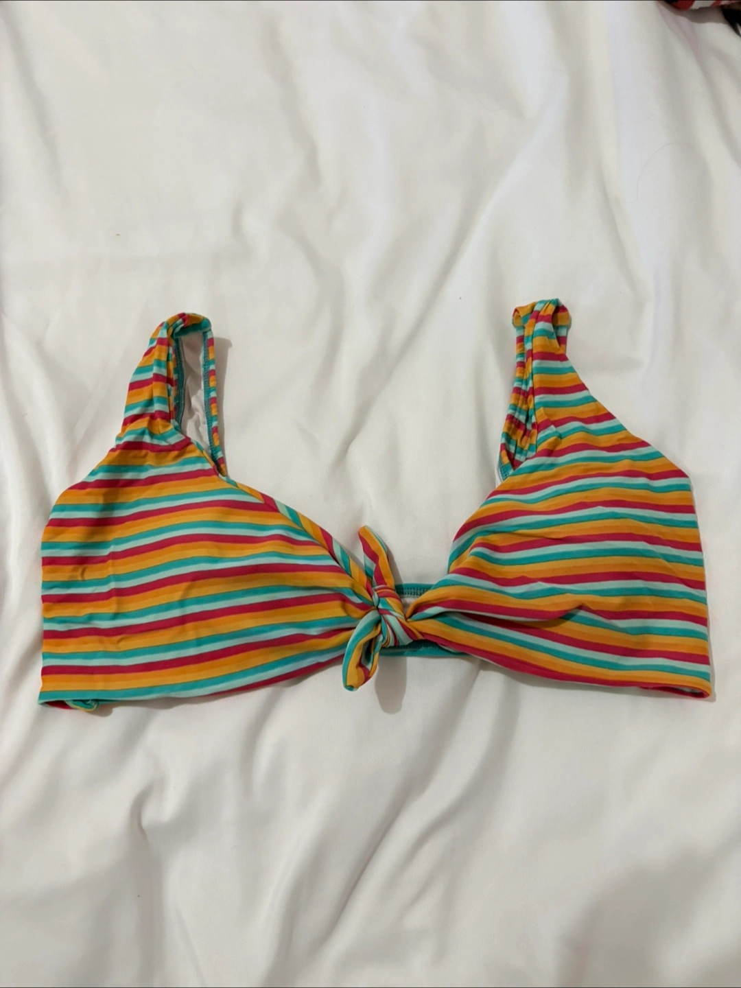 Multicoloured striped bikini top. Adjustable straps. Centre front tie detail. Excellent for summer.