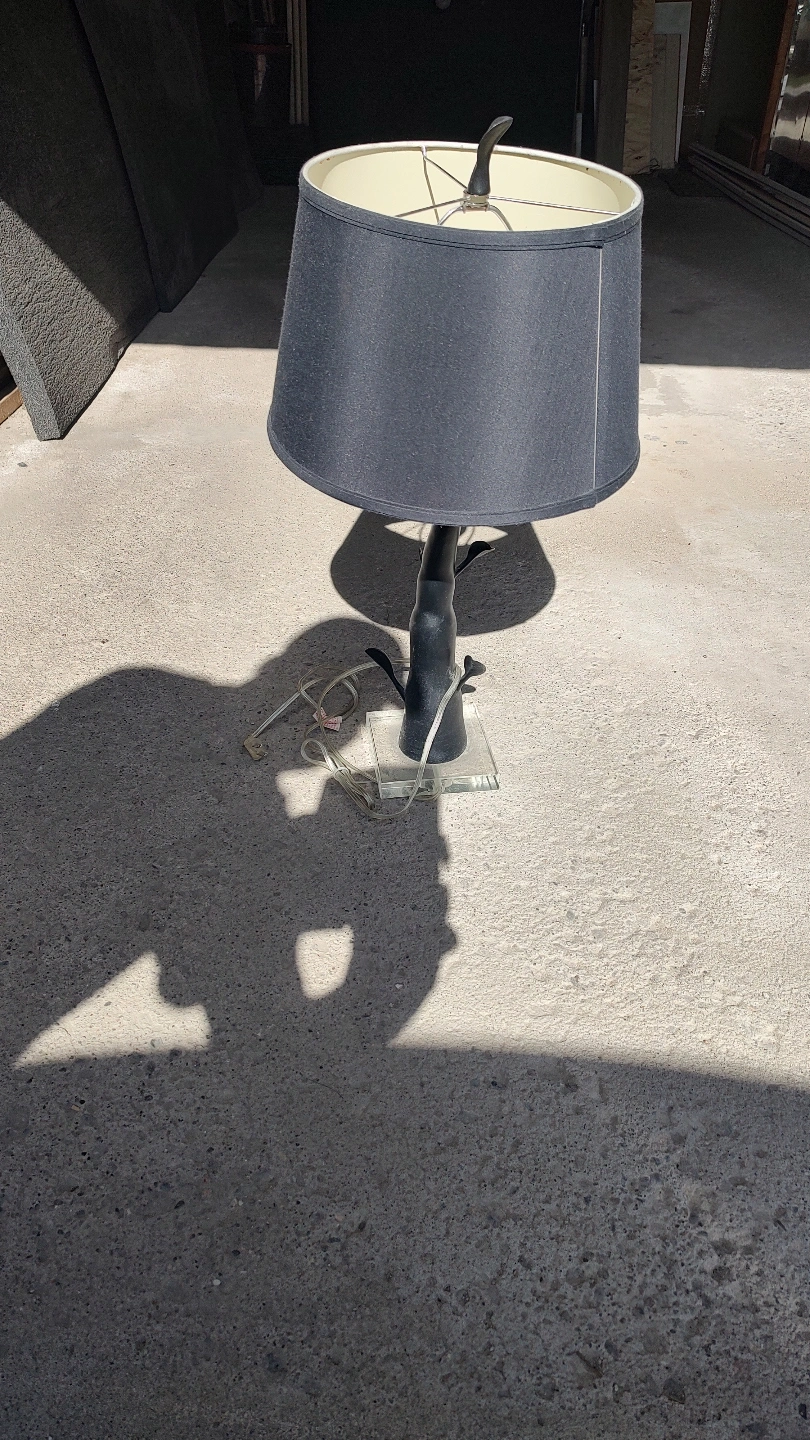 49Stylish table lamp. Black fabric shade. Abstract, possibly sculptural, base. Cord and plug included. Pre-owned.