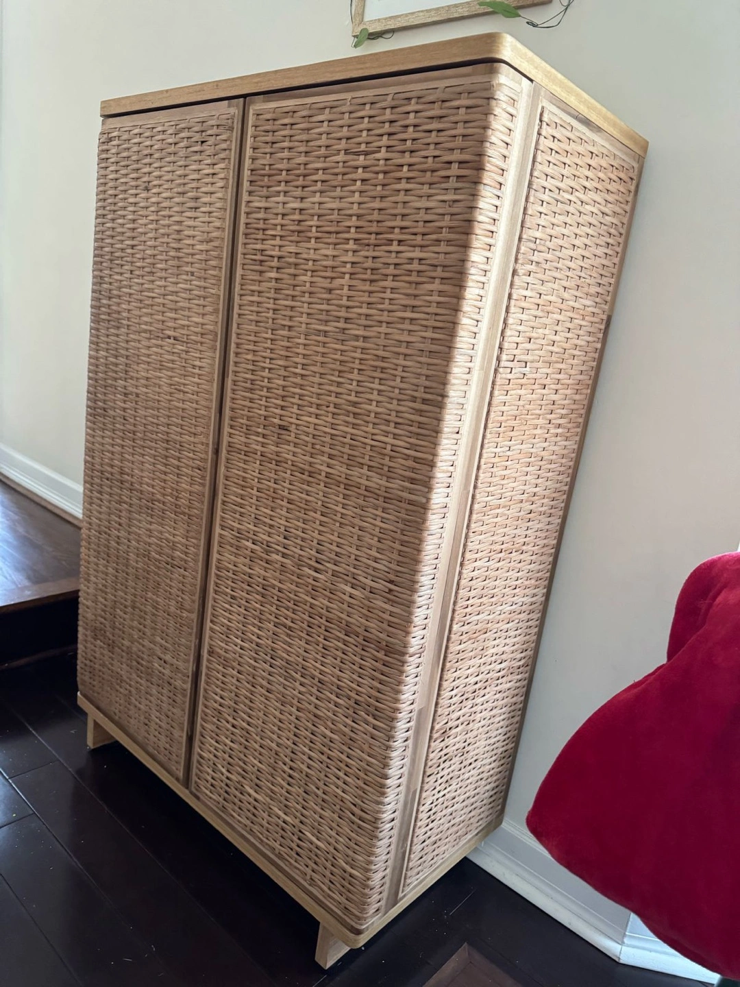 Beautiful bookcase cabinet, great for storing books or other items. Features rattan doors and wooden shelves. Perfect for a child's room or living room. Paid 399 + taxes.