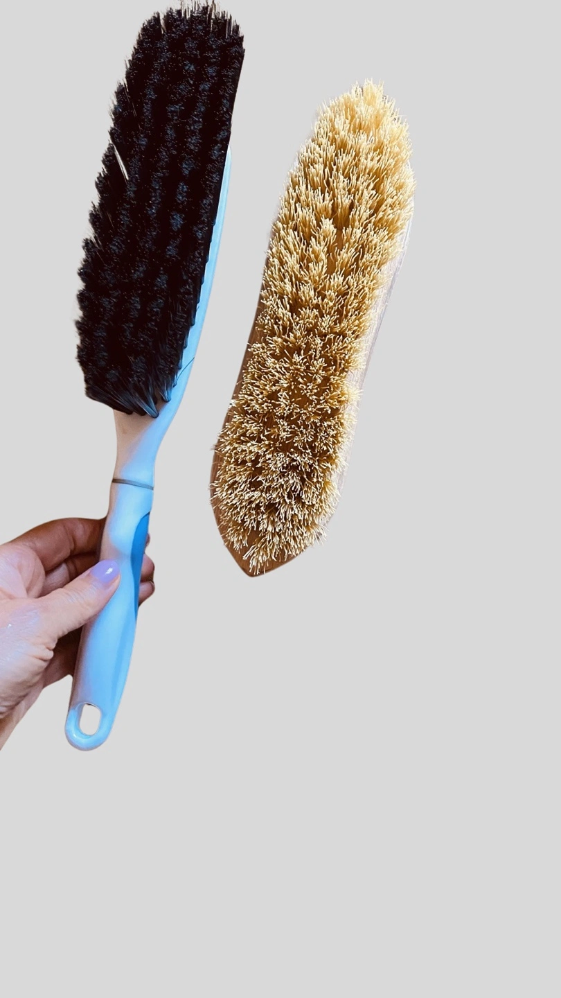 Two brushes for sale. One is a Crown Point 9" scrub brush with Tampico colored polypropylene fibers. The other is a Minky dustpan brush. Both are in good condition.