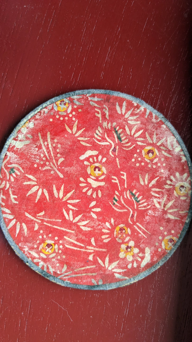 457Circular patch. Red background. Floral pattern. Shows some wear. Unique design. Great for crafting or collectors.