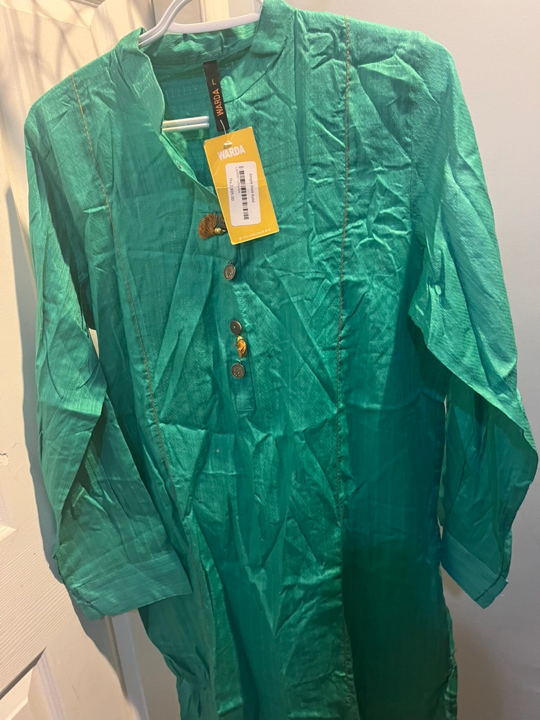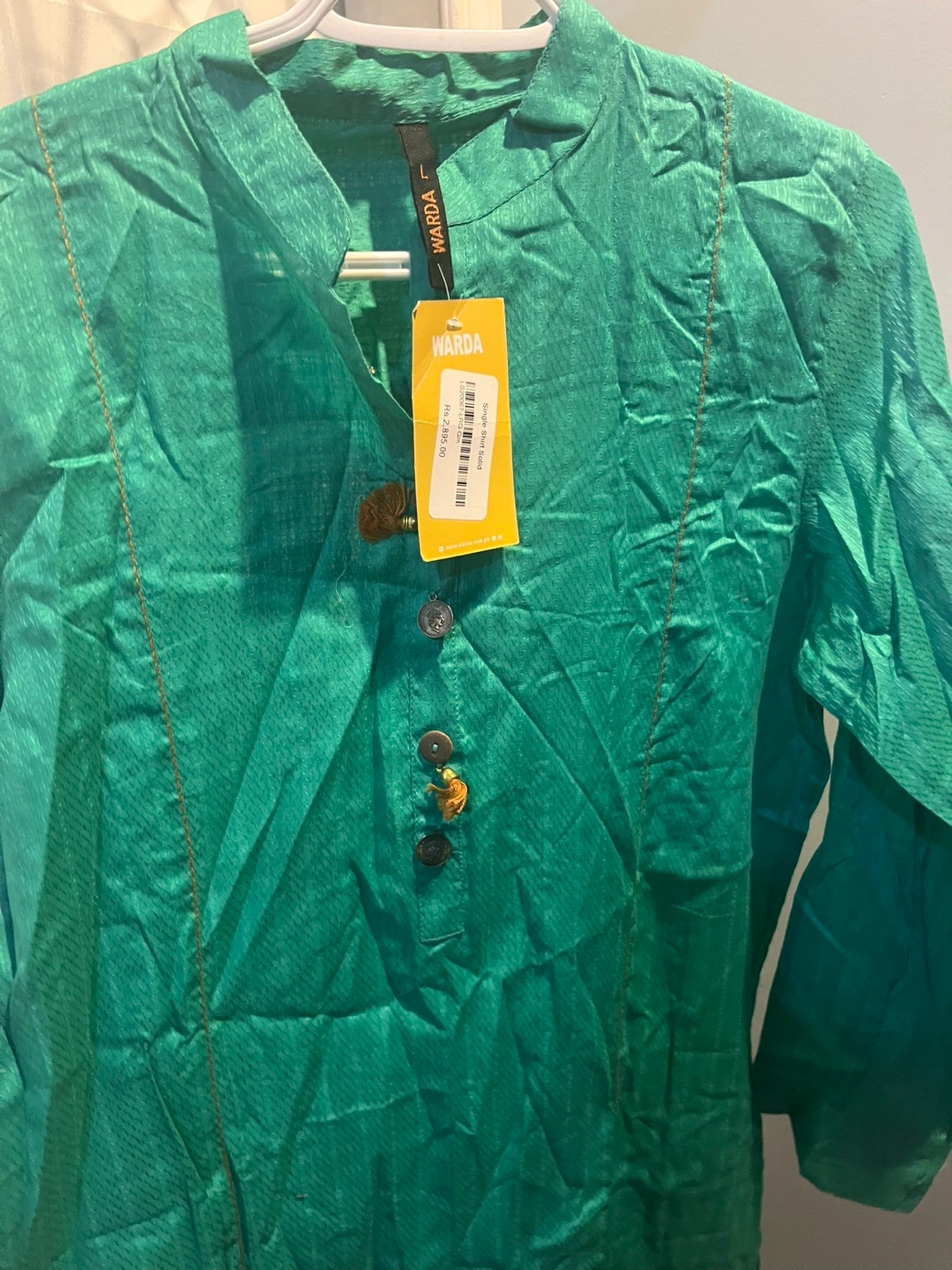 77Beautiful teal green Kurti. Long sleeves, collared neckline. Gold detailing. New with tag.
