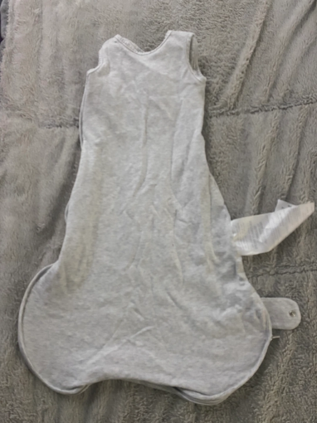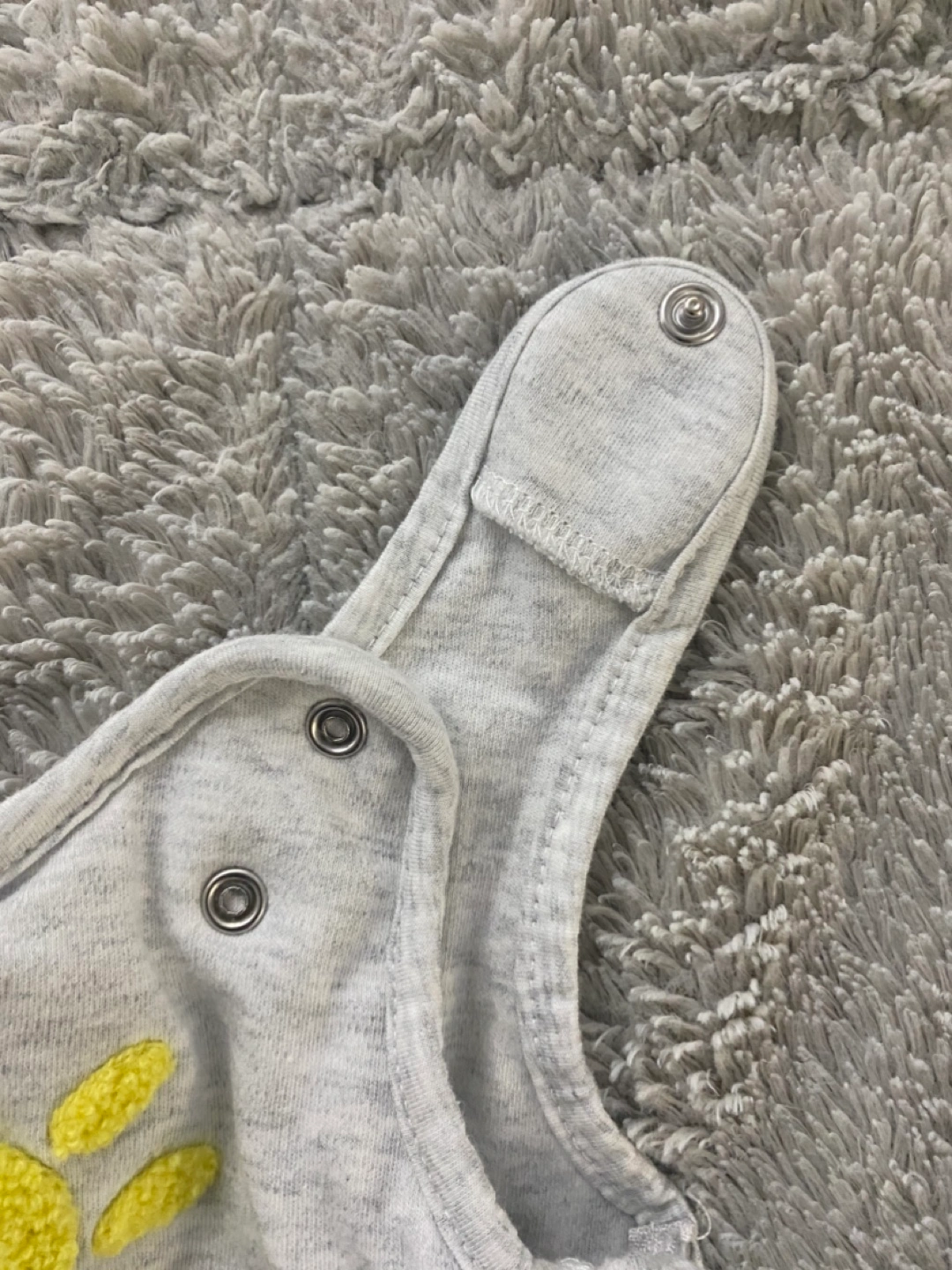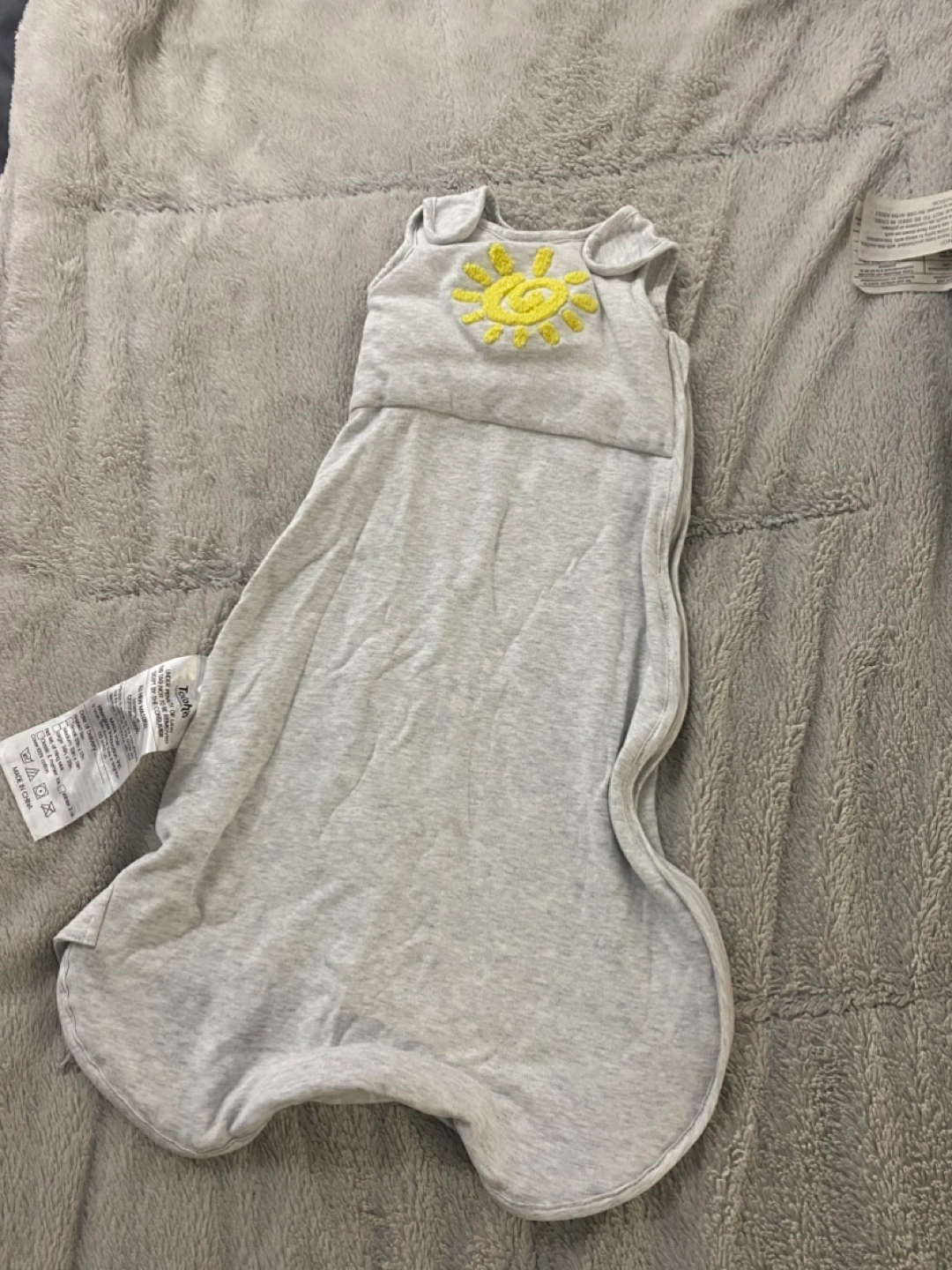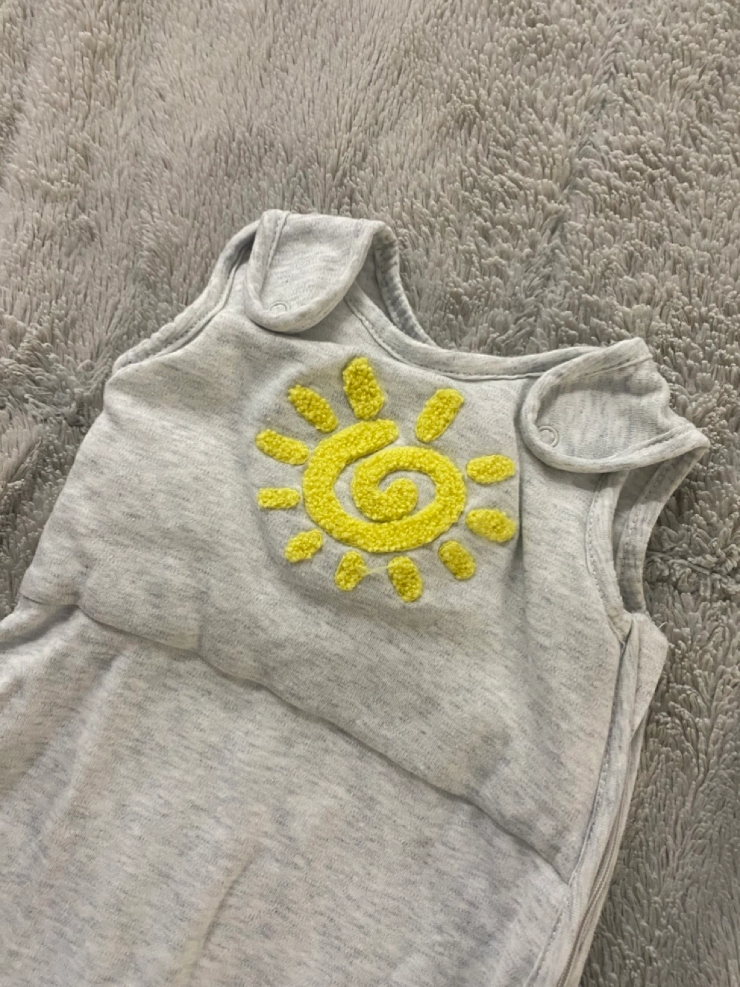 15Adorable baby sleep sack. Grey with a cute yellow sun design. Medium size. 100% cotton. Made in China.