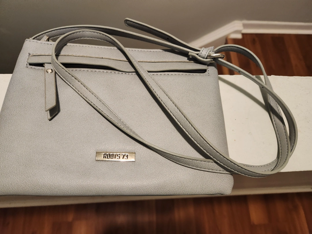 Small grey crossbody bag. Features zipper closure and adjustable strap. Excellent for everyday use.