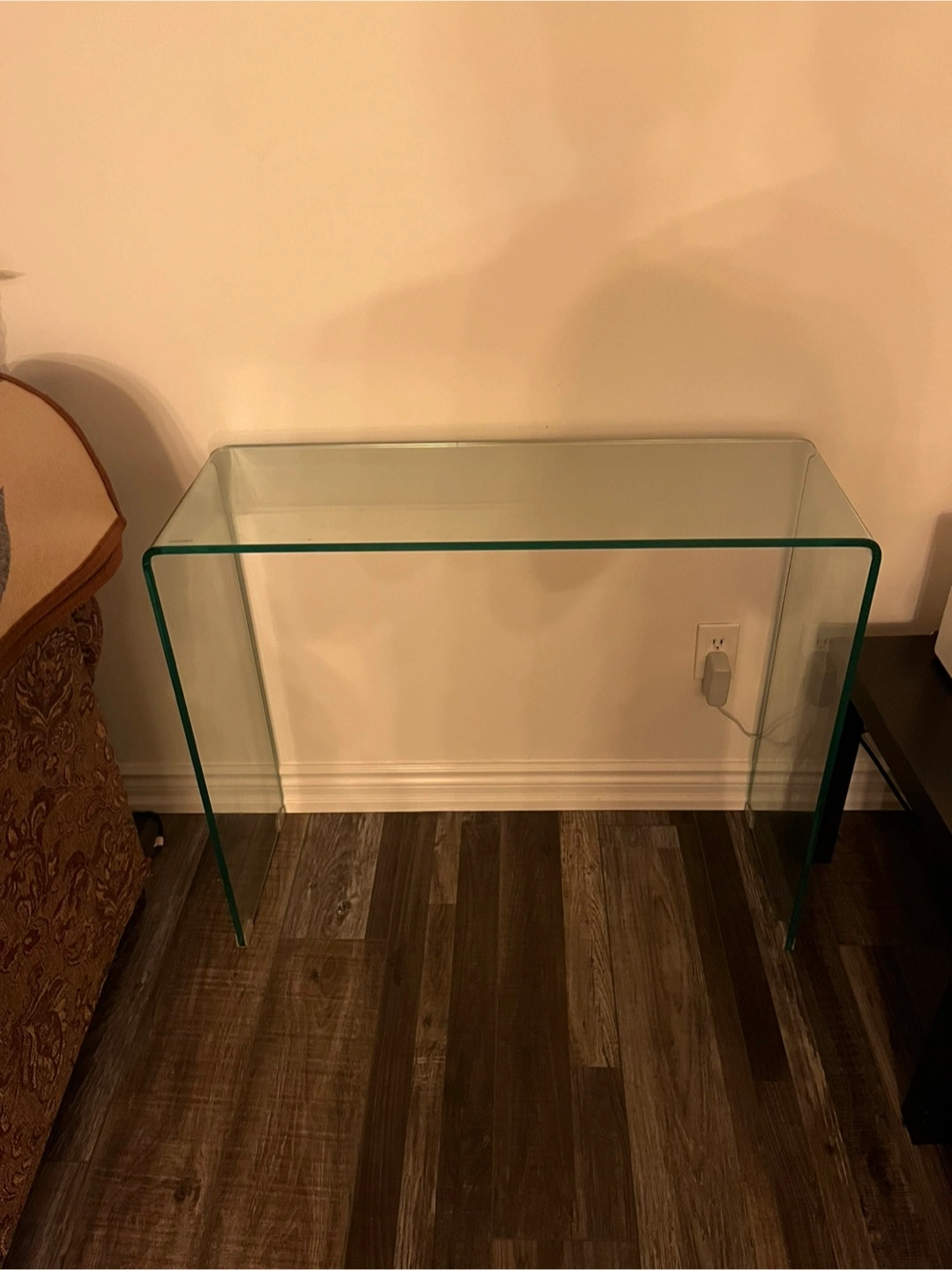 Sleek, modern design. Clear glass top and frame. Perfect for entryway or living room. Minimalist style.