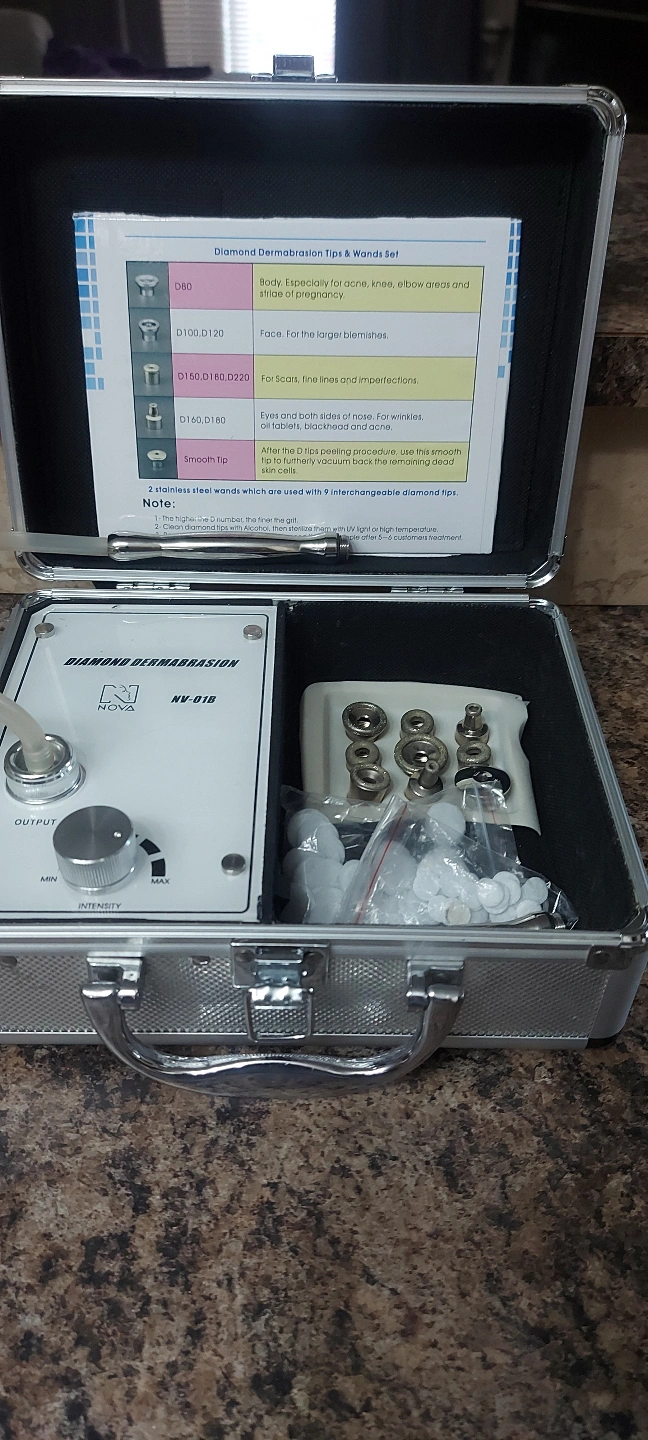 Diamond dermabrasion kit. Includes carrying case, wand, 9 interchangeable diamond tips, and extra replacement tips. Suitable for face and body. Used for exfoliation and skin rejuvenation.