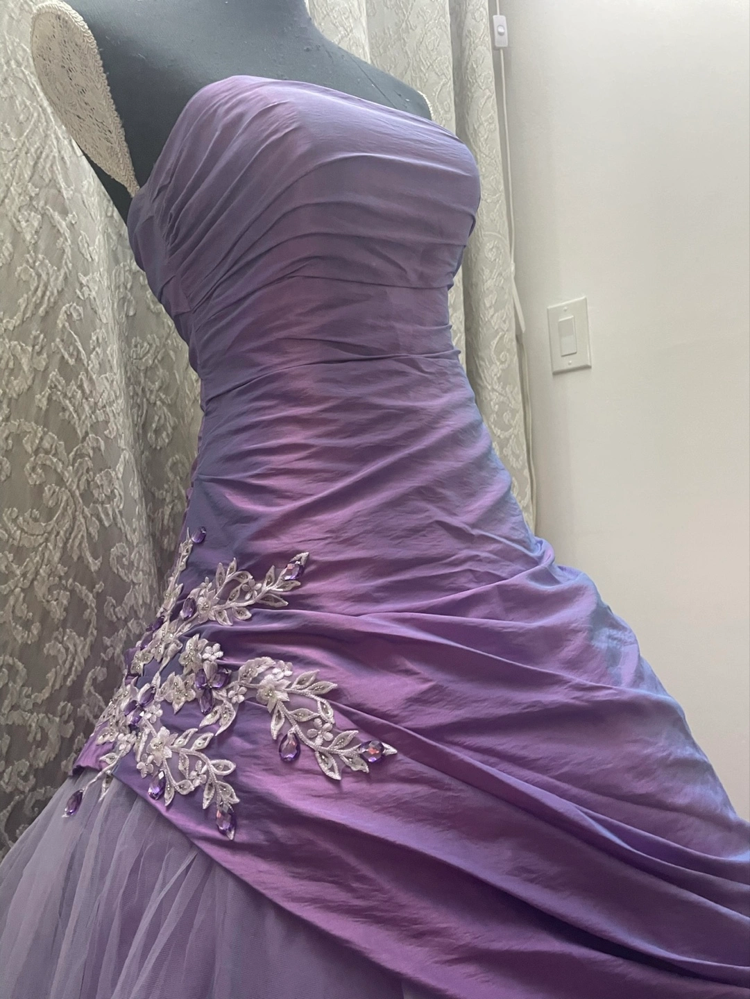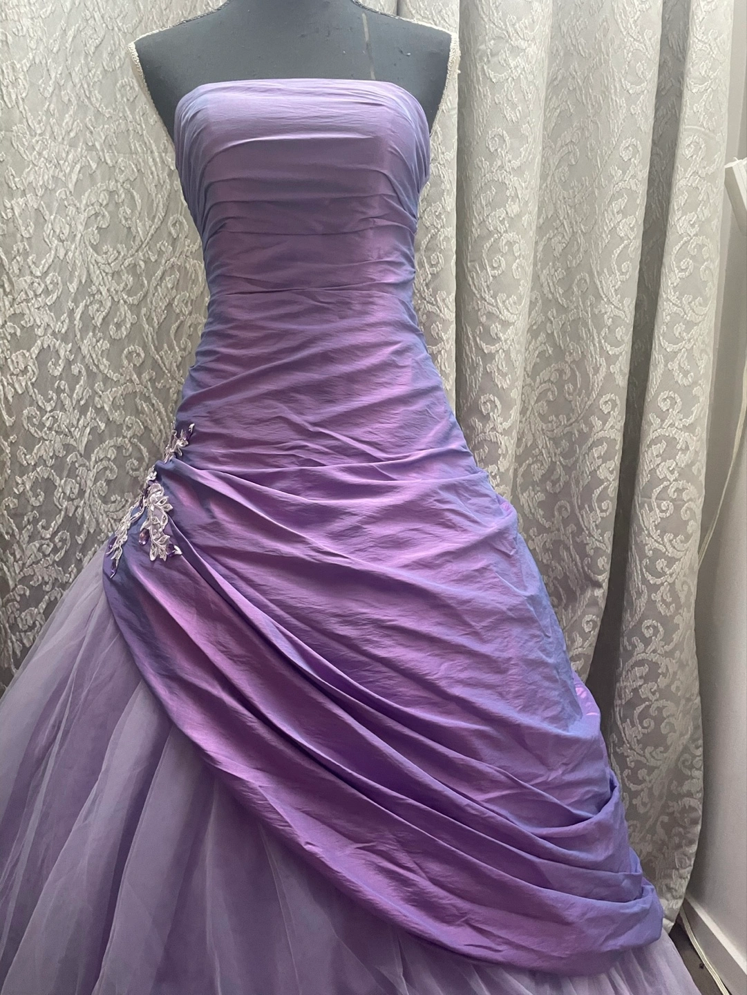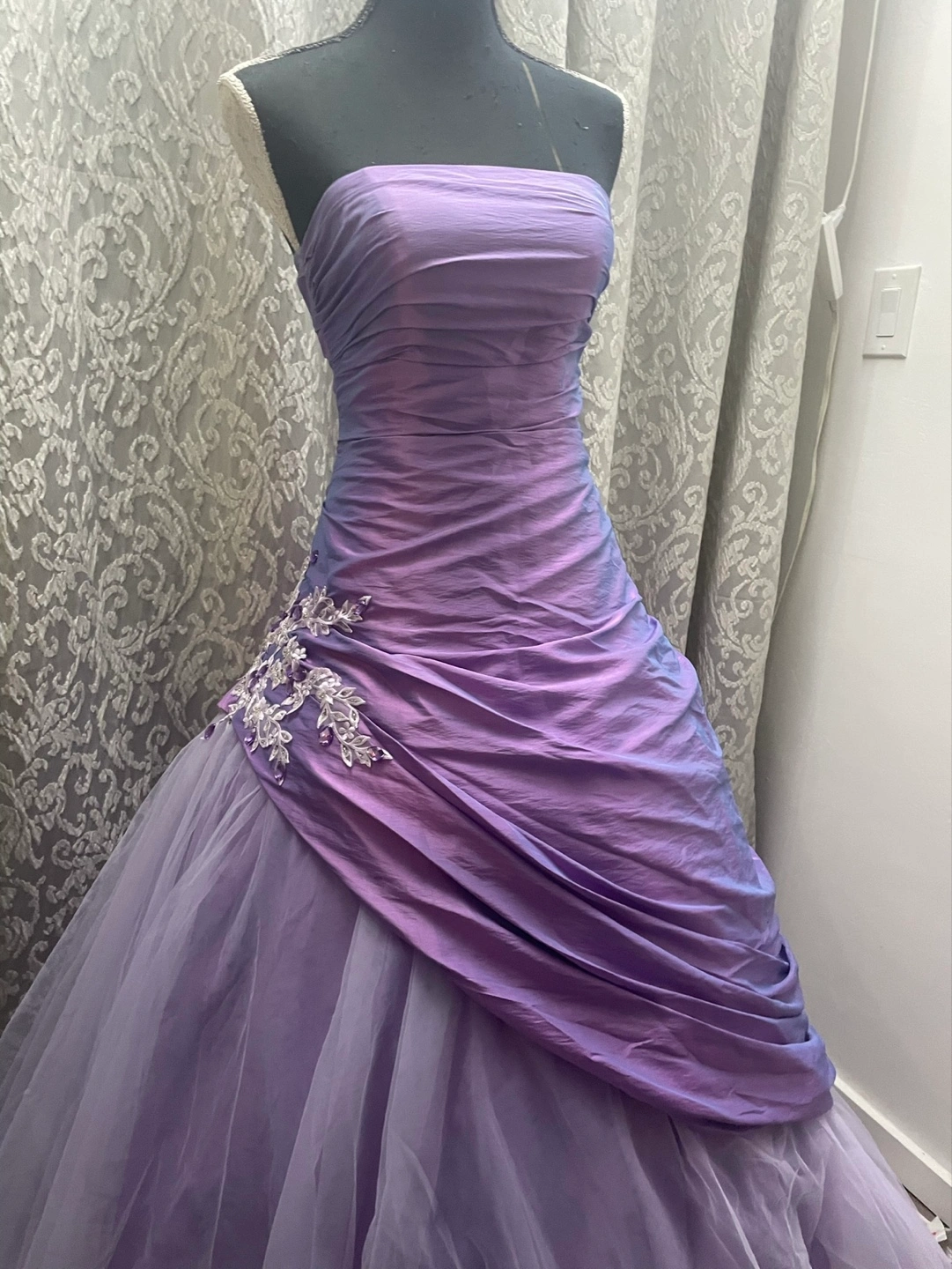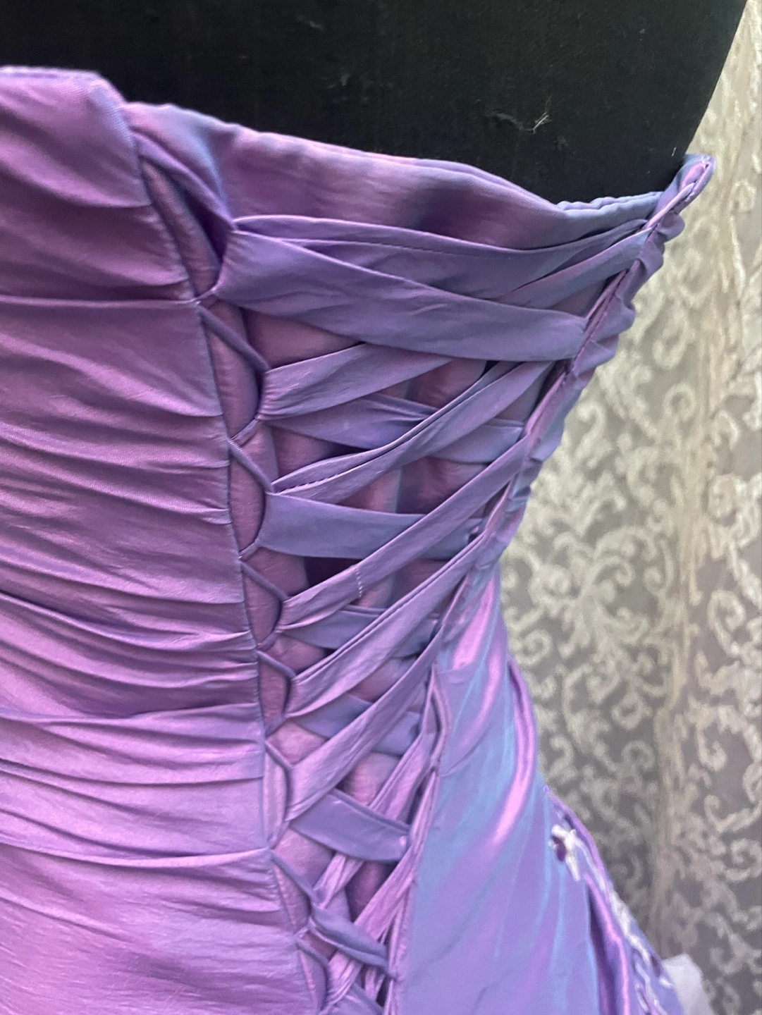 Features a layered tulle skirt and a beautiful lavender taffeta bodice.