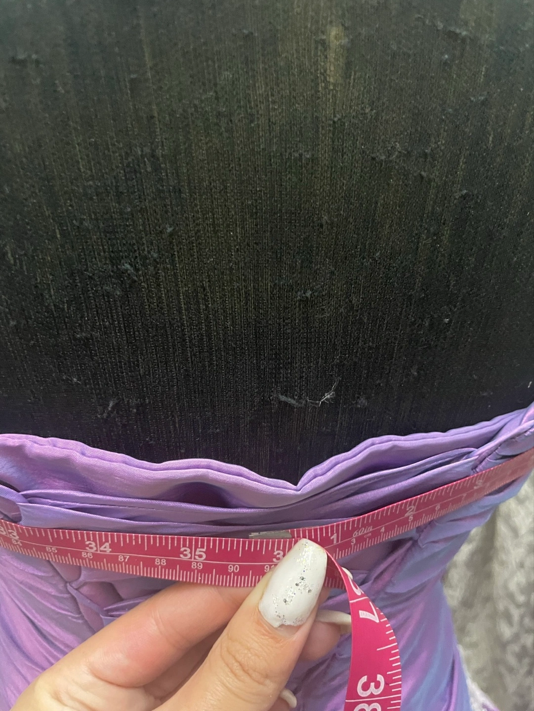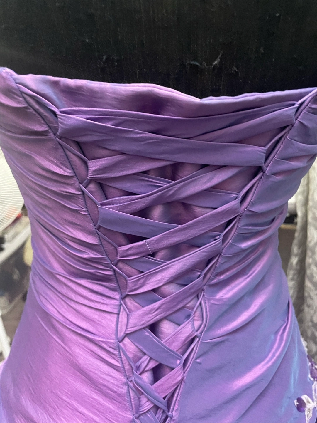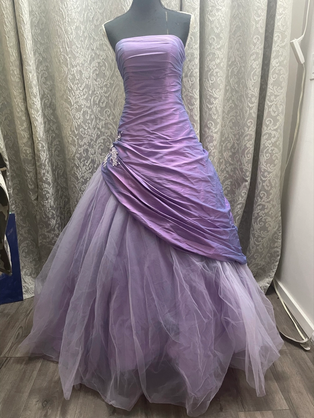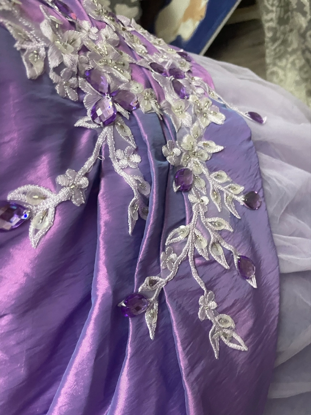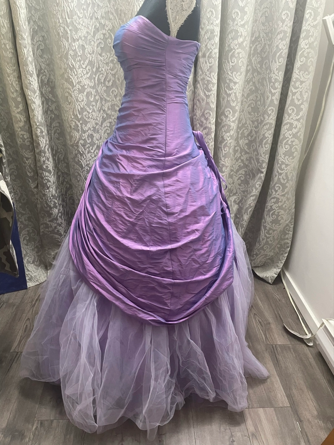 Features a layered tulle skirt and a beautiful lavender taffeta bodice.