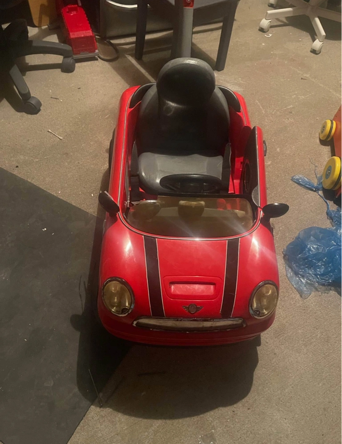 Red Mini Cooper-styled ride-on toy car. Features a removable push handle. Suitable for young children. Pre-owned.